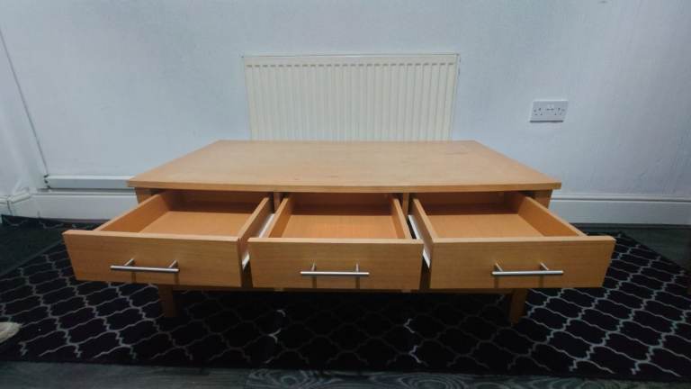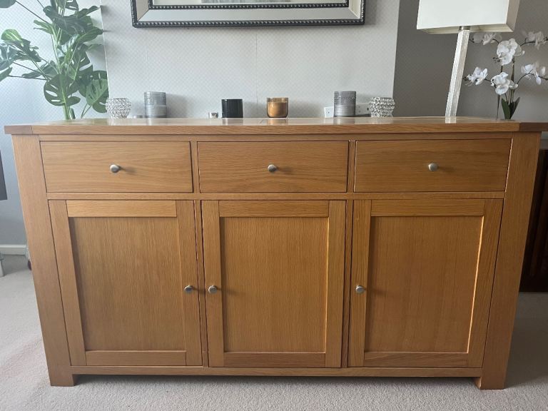 Beautiful light oak wood side cabinet in good condition, perfect for a dining room, living room or hallway. Offers plenty of storage with 3 spacious drawers and 3 cupboard doors, ideal for keeping your home tidy and organised.