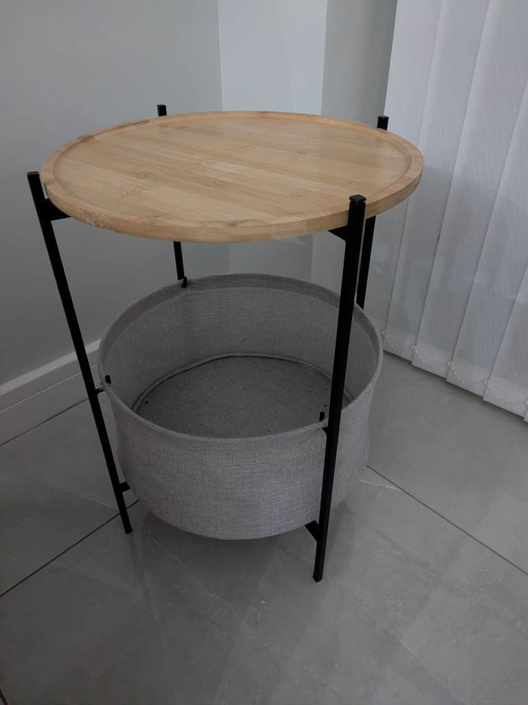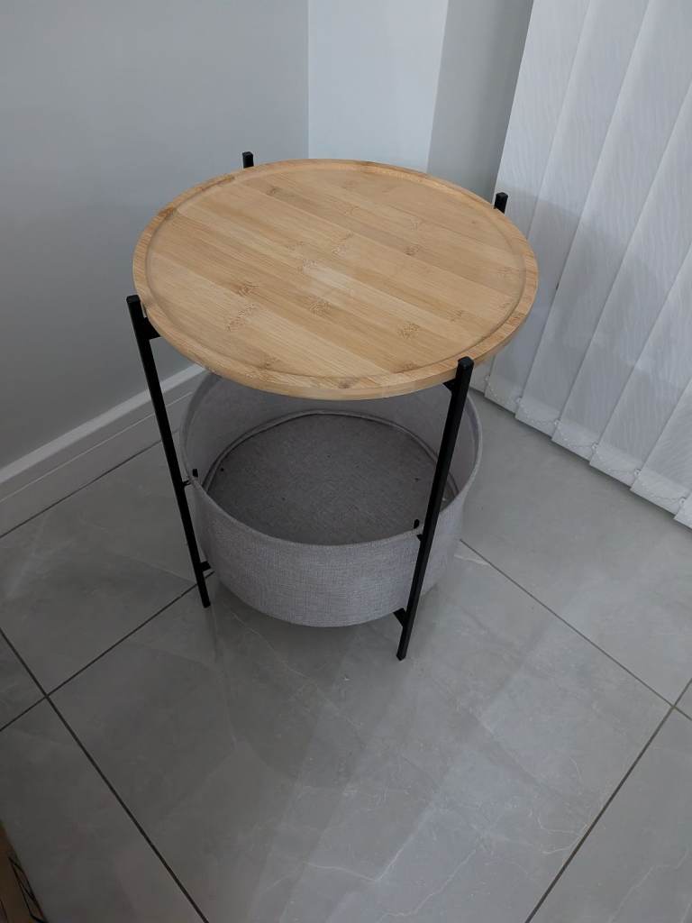 Wooden top side table with grey basket underneath excellent condition