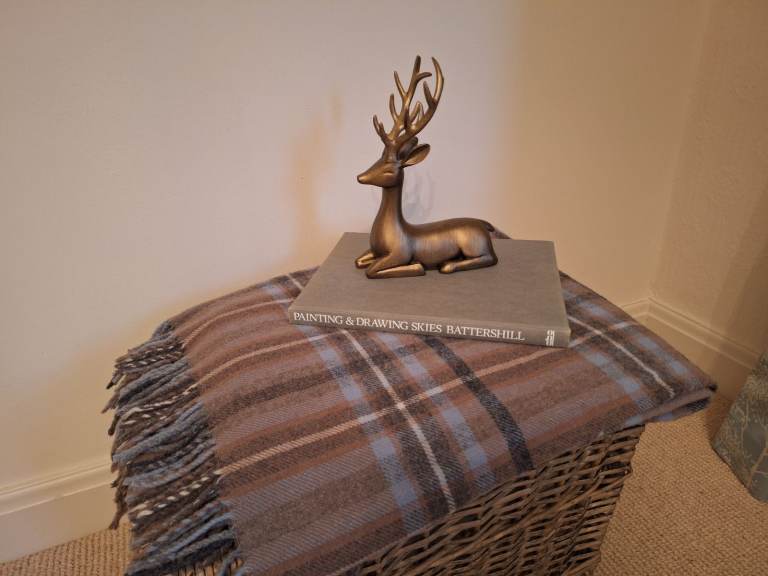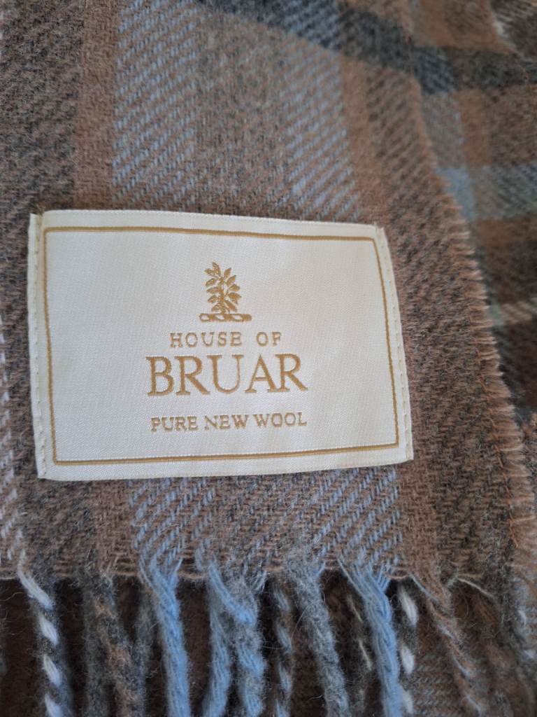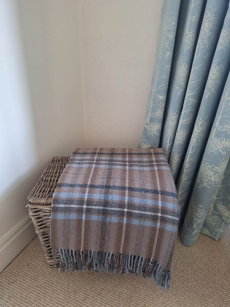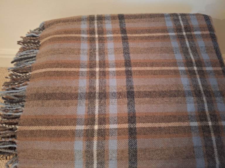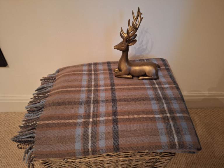 house of bruar pure new wool throw blanket. it is soft, with luxurious feel. perfect size to drape over a sofa or add layering to bed. has tasselled edge detail. blue brown colour with classic check pattern. Brand new. (retails at £85).home decor bundle includes throw, book and stag ornament.
