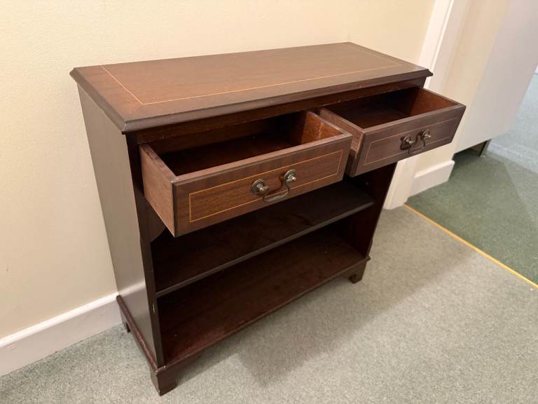 Nice free-standing mahogany-coloured bookcase or side table with two useful drawers. Moved house and sadly don't have enough room for this. From a smoke- and pet-free home.