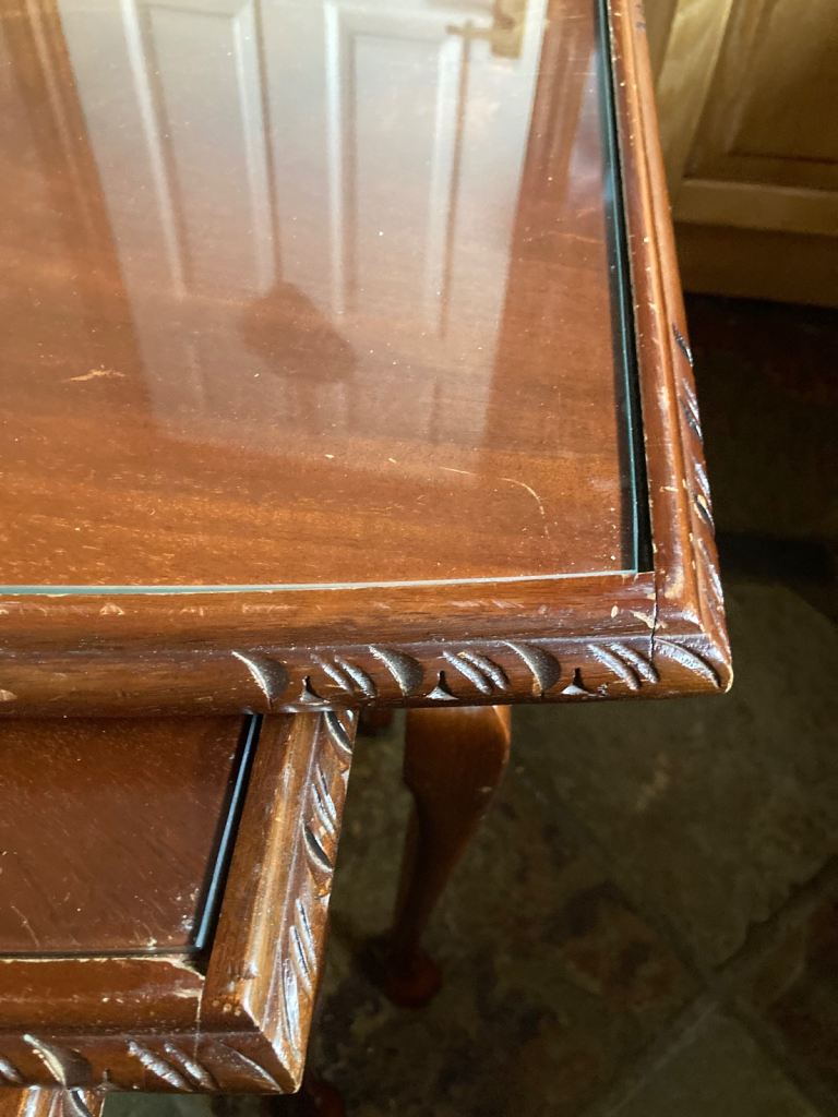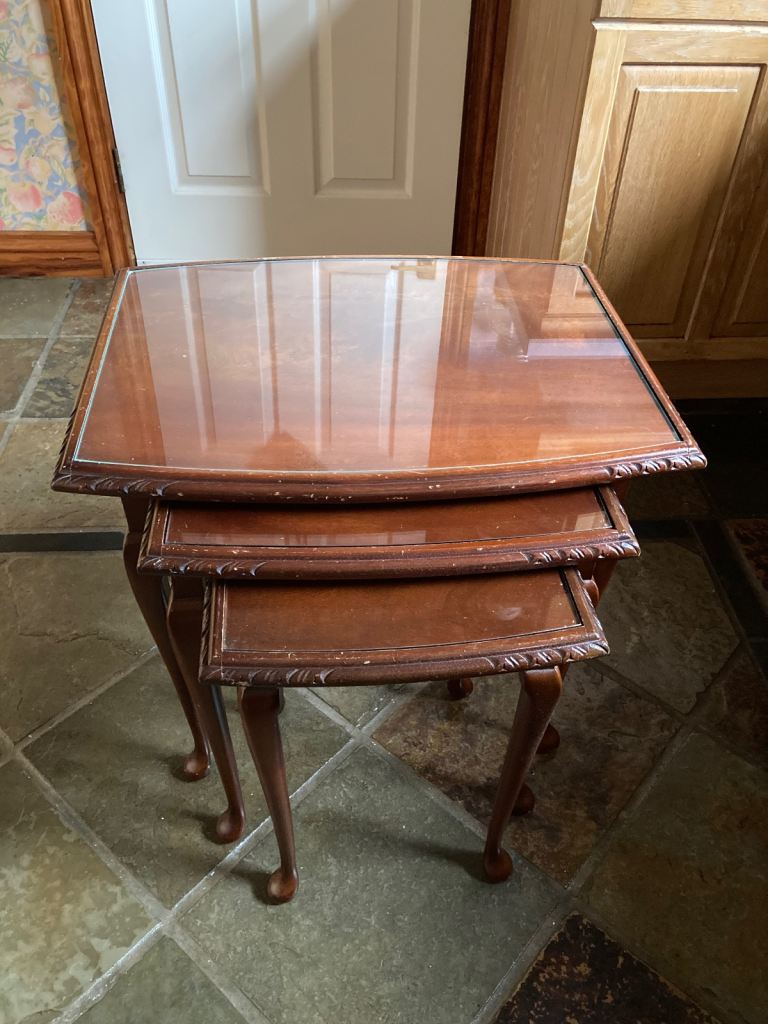 Mahogony nest of 3 glass topped occasional tables. Featuring Queen Anne legs. Great condition. Top table 1’10 in x 1’5 in x H 1’9 in or 56cm x 43cm x 53cm