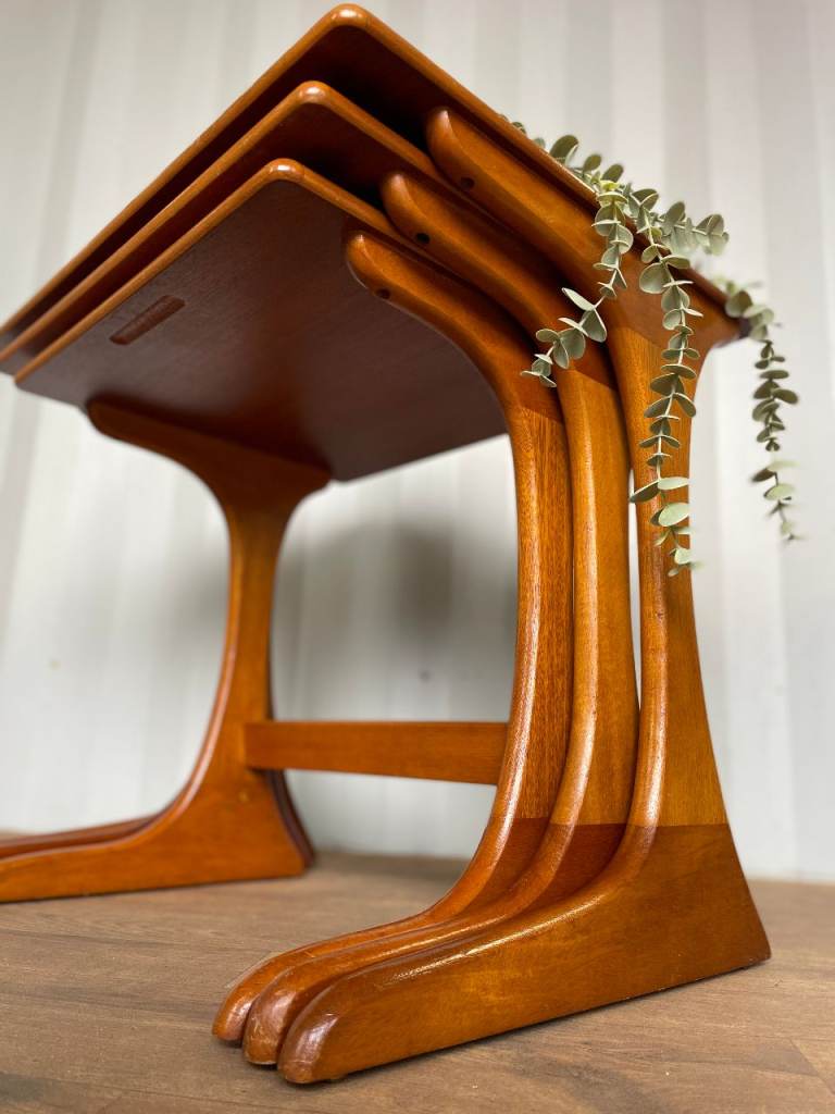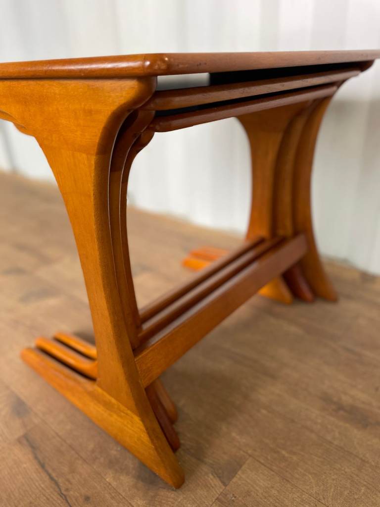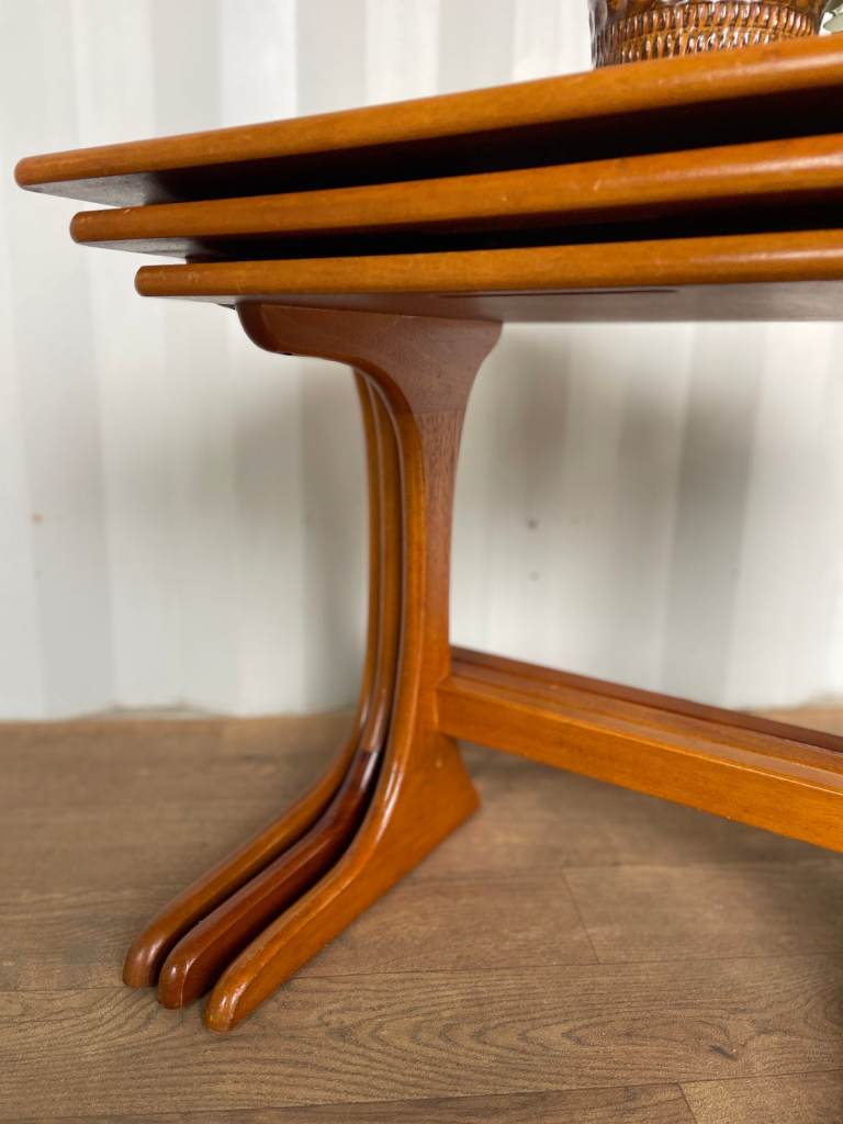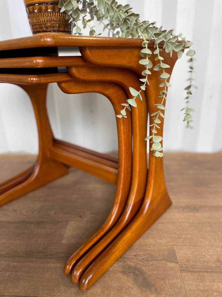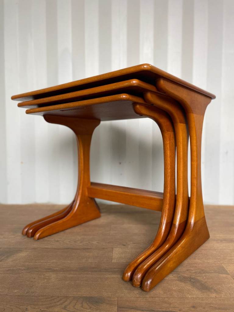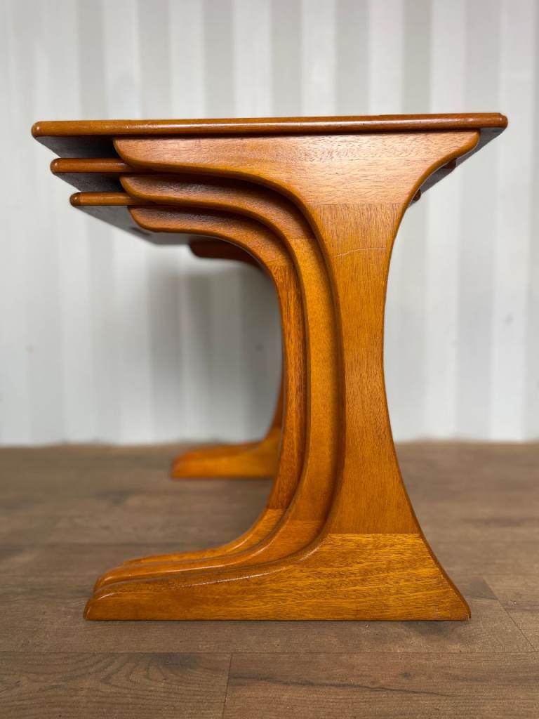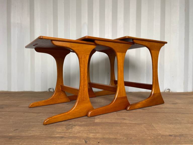A genuine mid-century modern G-Plan Fresco nest of tables, designed by Victor Wilkins and made in the UK. This three-piece teak set features elegant curved legs and warm natural grain, typical of quality 1960s British furniture.