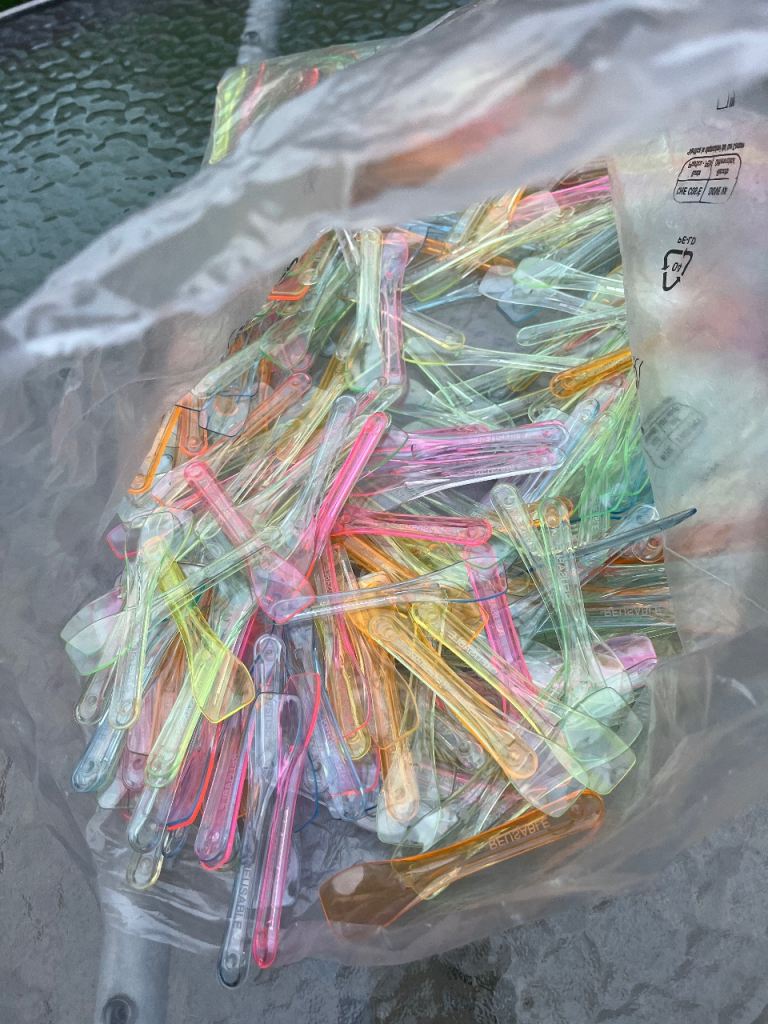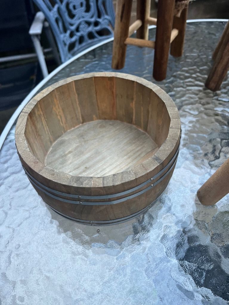 A mix of 6 small wooden tables that displayed cakes in In a cake shop , the tables are 7 inches high x 6 inches wide ideal for small plants etc + a small wooden barrel + a wicker basket + a bag of a couple of hundred plastic ice cream spoons ( buyer collects ) £25 for them all