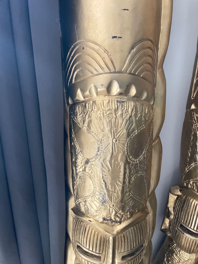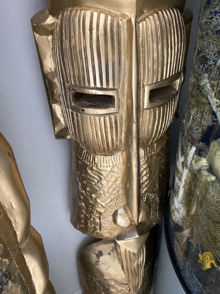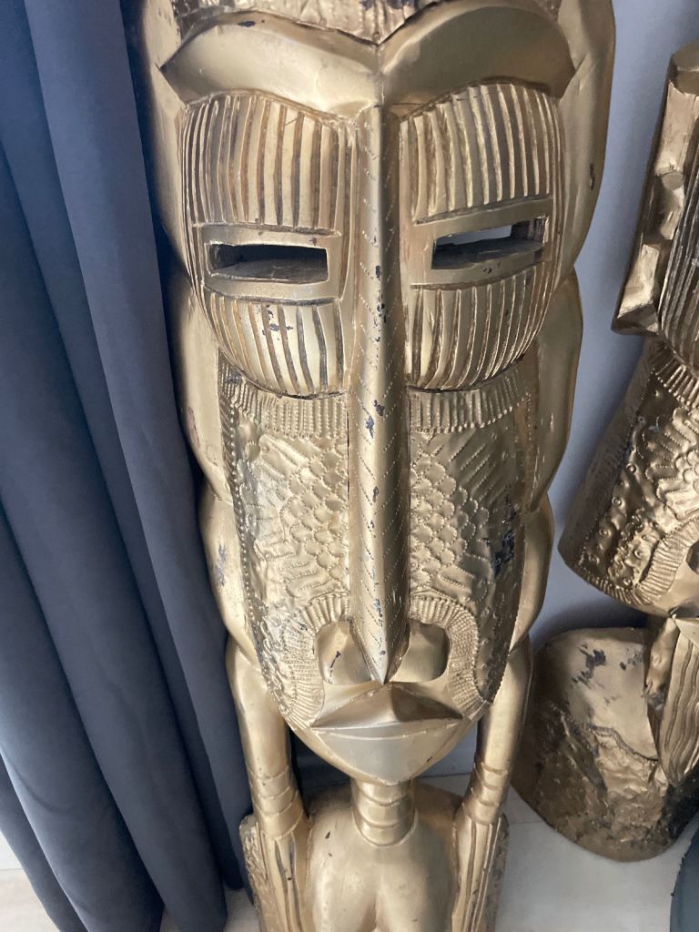 Beautiful 6ft tall hand carved wooden male & female tribal mask statues. inspired by West African Art, from the Makonde & Fang culture. Sprayed in gold metallic paint with the foil on areas of face & mask areas. Signs of wear as used for props at recent wedding. Would look amazing in a hallway or conservatory. Very unique.