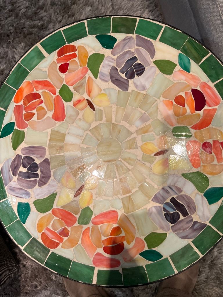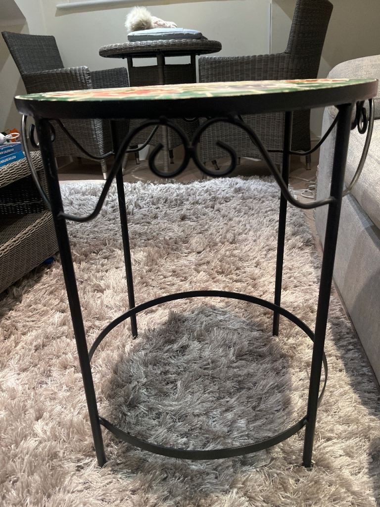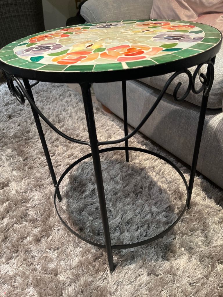 small round mosaic table. Used indoors but seen this type used outdoors too. Ideal as a side table or coffee table. From a smoke free home in lovely condition as usually in a barely used part of the room with a lamp on at the moment. Easy collection from central location with parking. Should easily fit in boot with seats down. Quick sell wanted as moving.. Believe it’s metal, certainly looks like it.