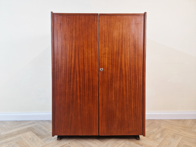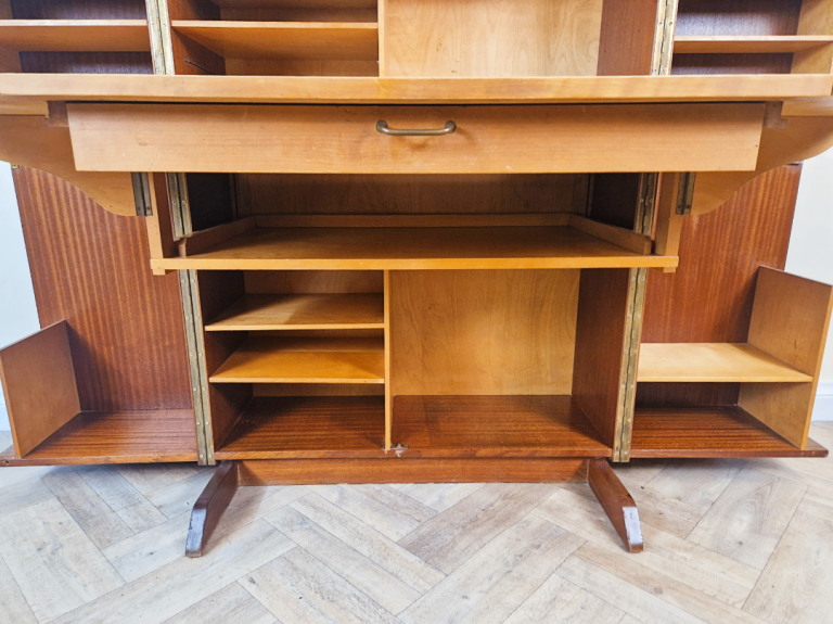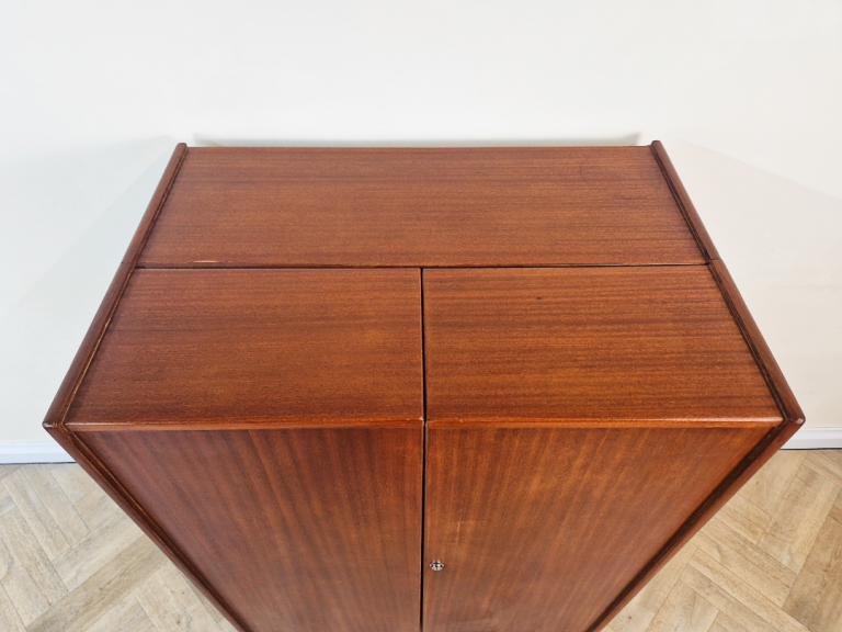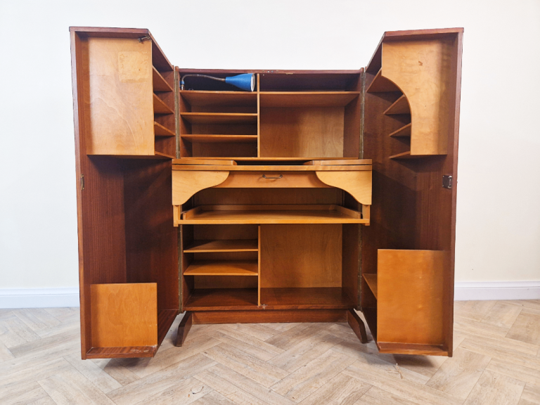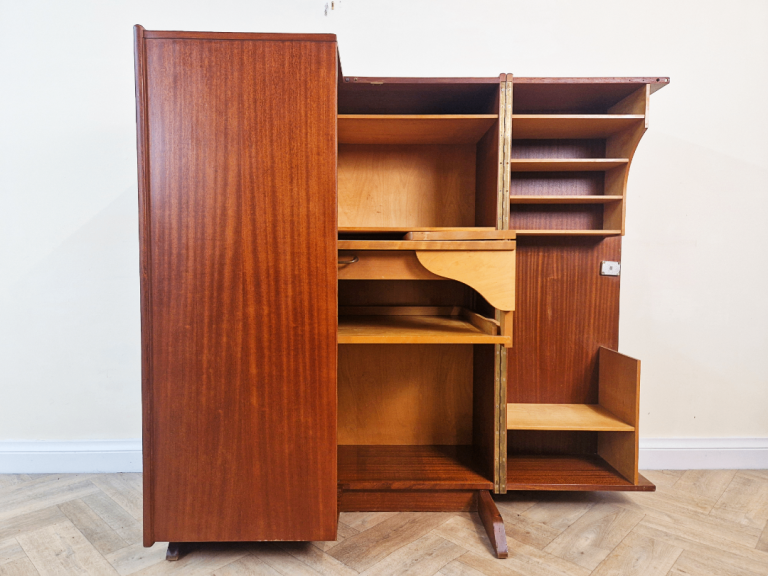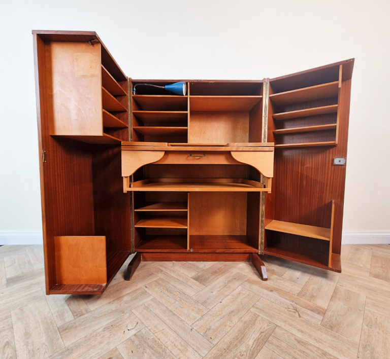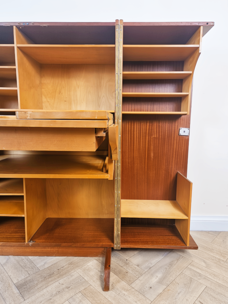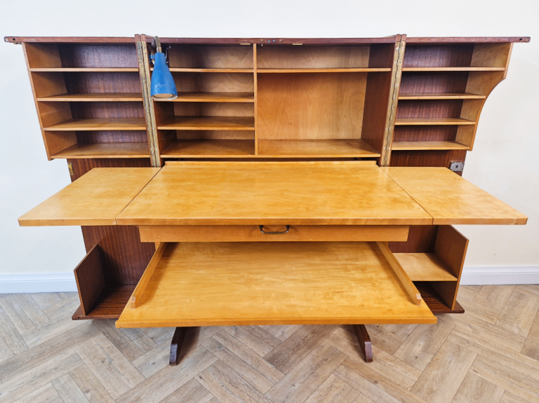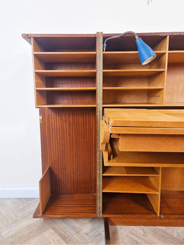 We are delighted to offer for sale this phenomenal "Magic Box" secretary desk by master makers Mummenthaler & Meier (Switzerland, 1960s). This ingeniously foldable masterpiece closes and locks securely with its original key, cleverly transforming into a compact cabinet. When opened, it reveals a generous writing surface and includes its own period-correct built-in light (supplied disconnected; requires a UK plug). A stunning fusion of Swiss precision engineering and timeless mid-century design.