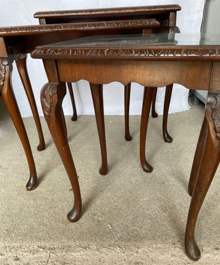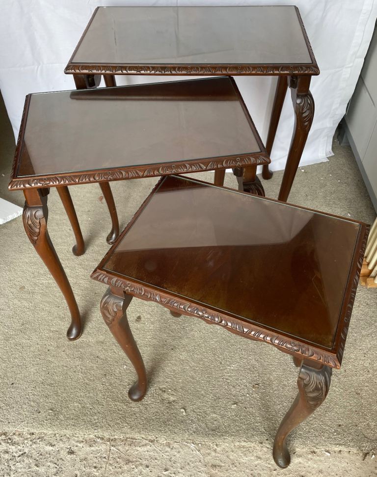 Nest of 3 dark wood tables with glass tops in used condition