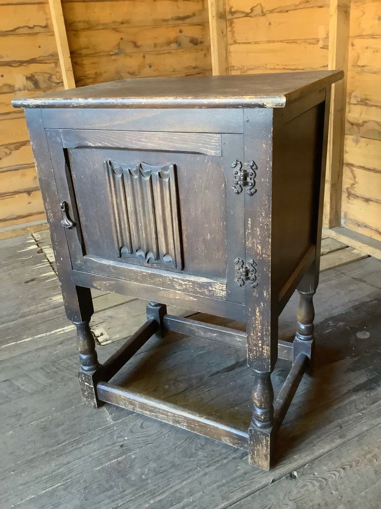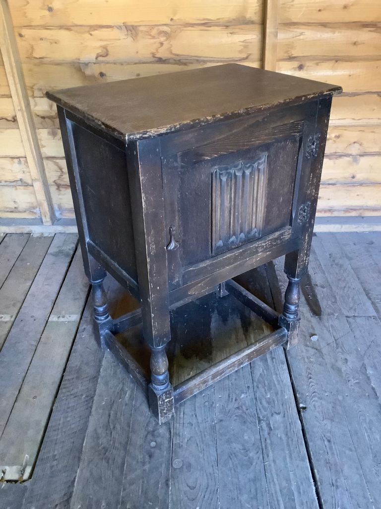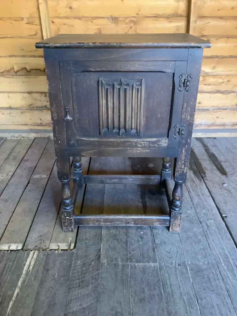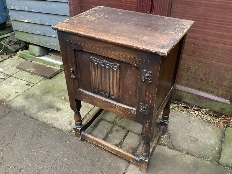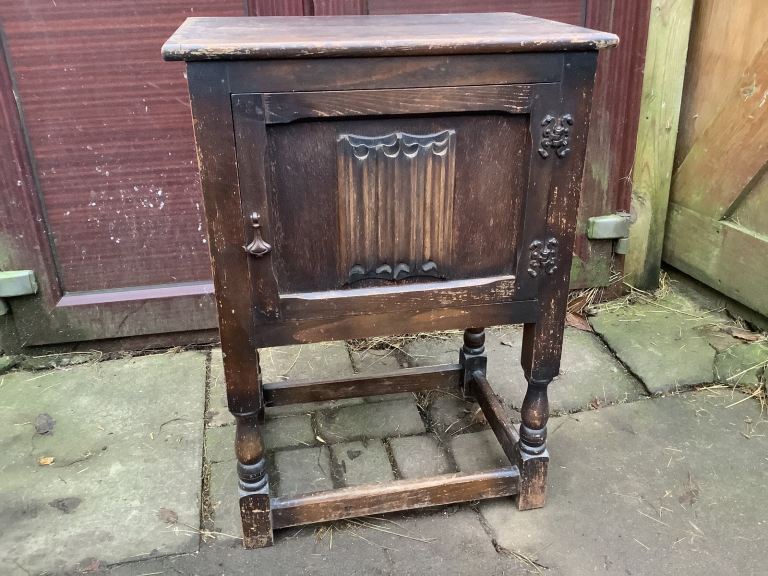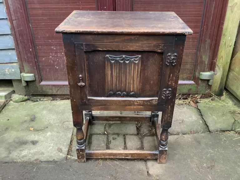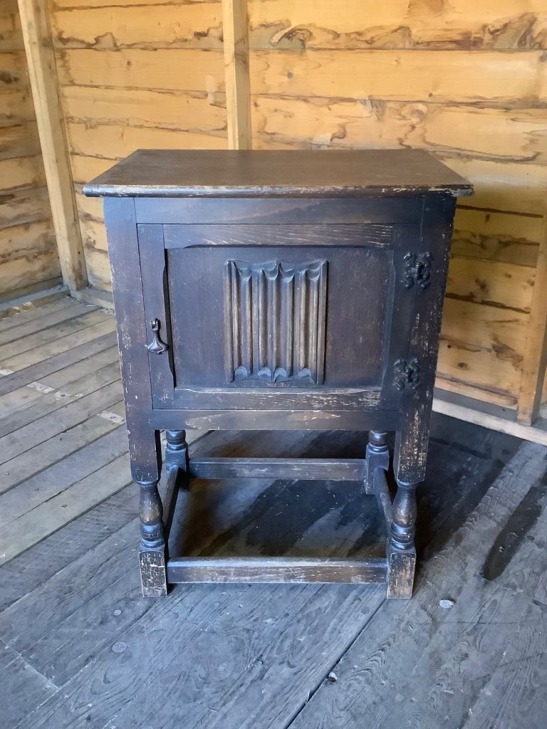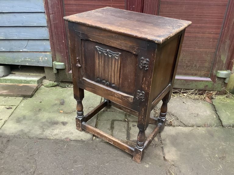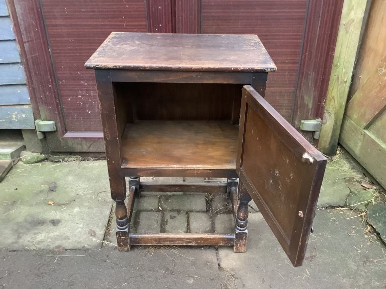 Oak old charm line fold one door, bed side cupboard with bolster turned supports it's been waxed using briwaxed as recommended, by professional furniture restorers and the cupboard is very sturdy. Size. 51cm length, 35.5cm width, 71cm floor to top, 34cm depth by 71cm high. Collection only.