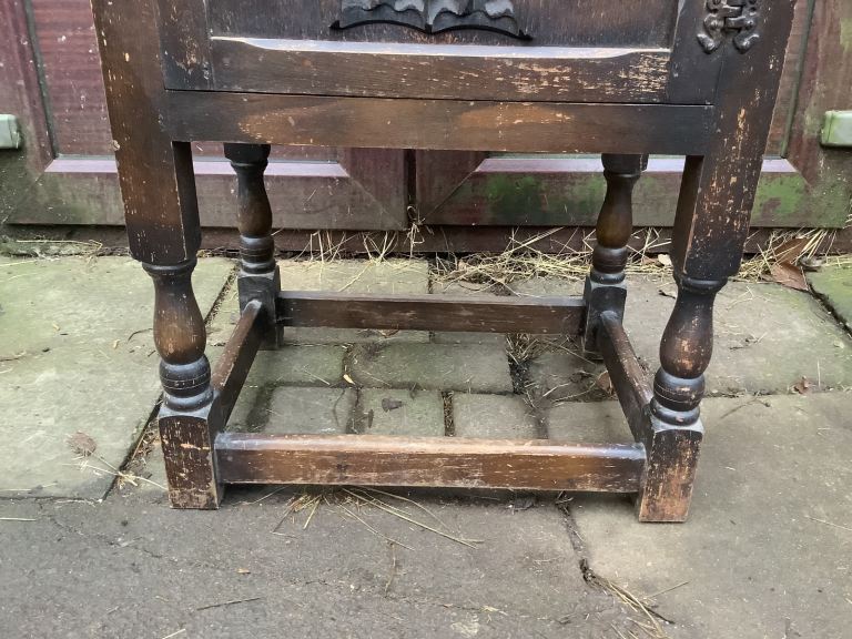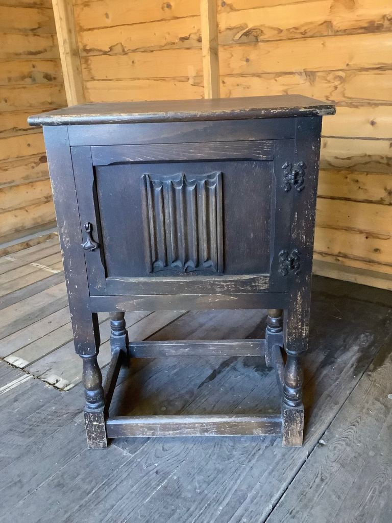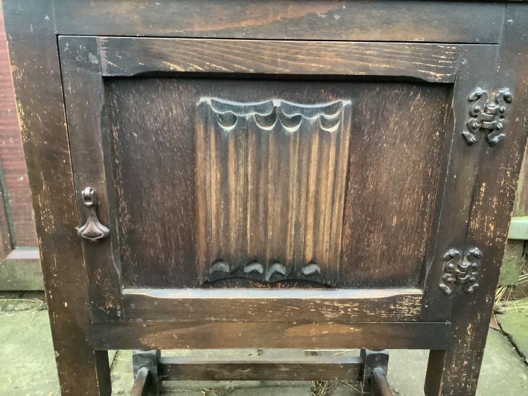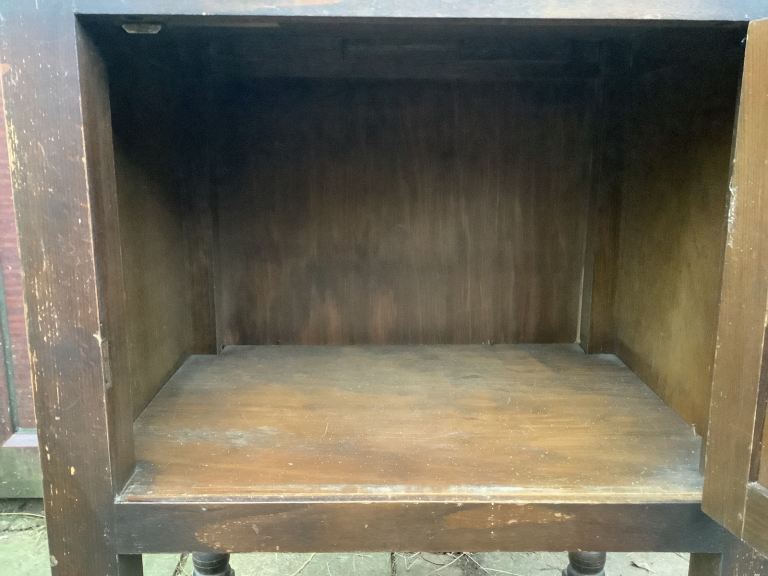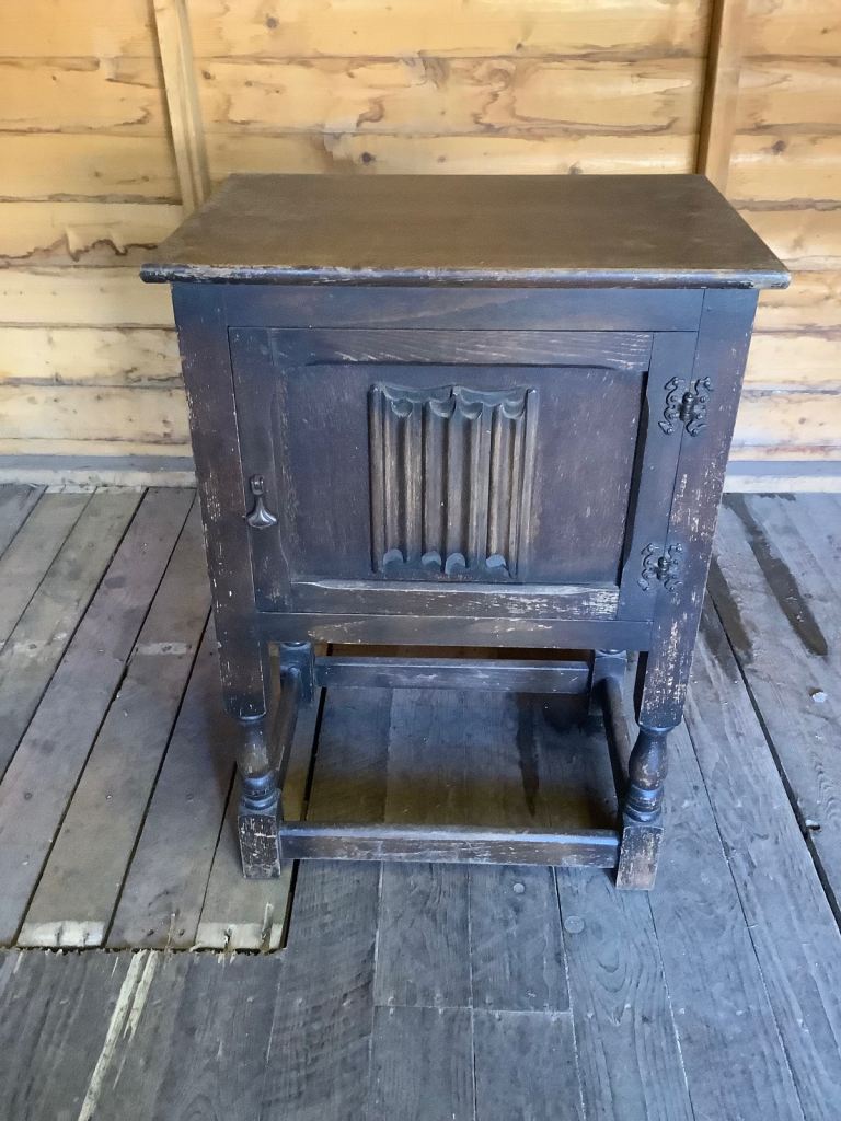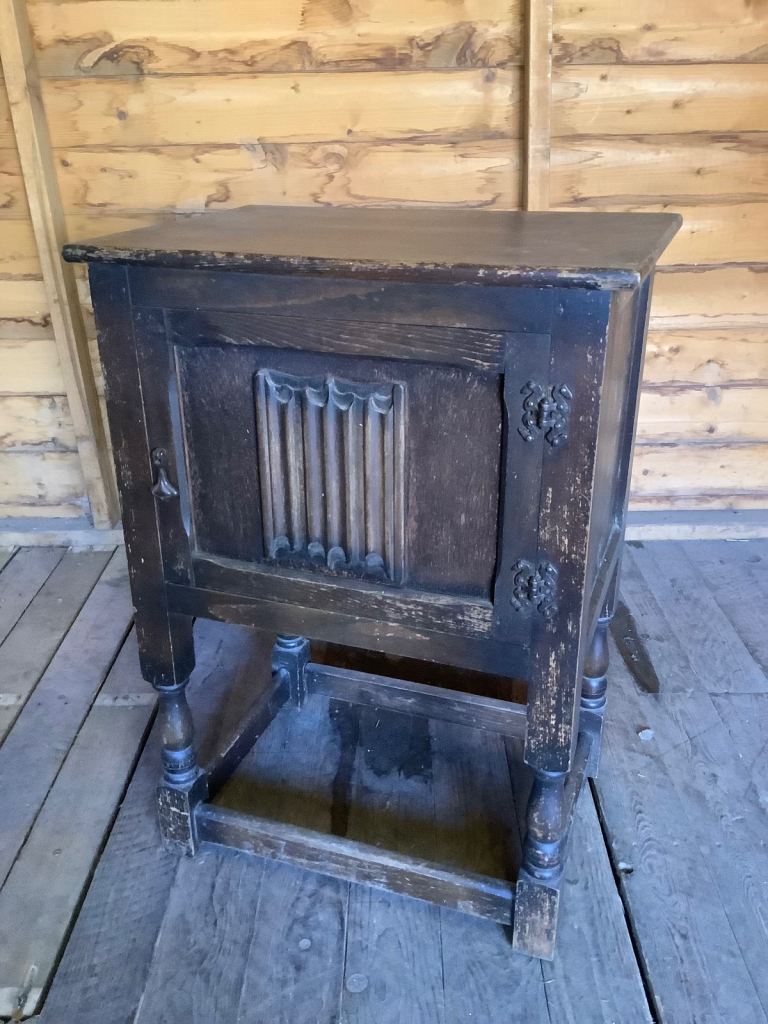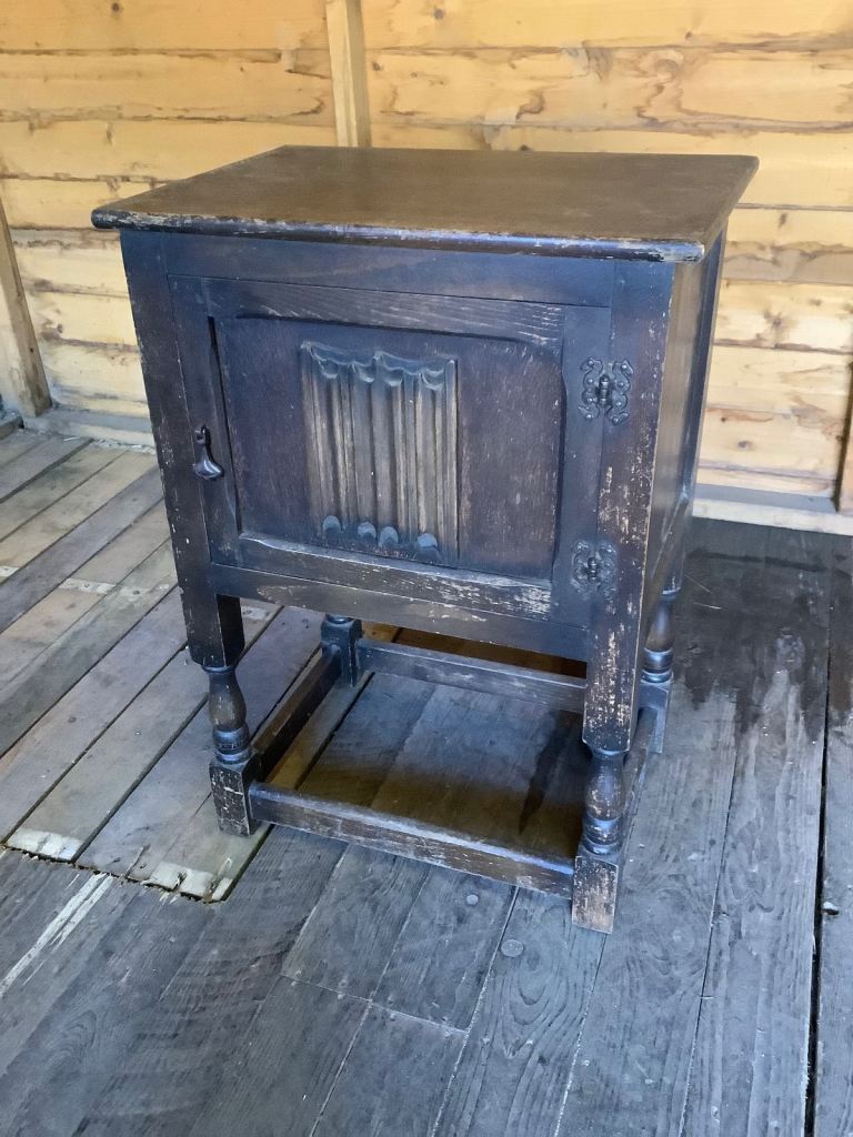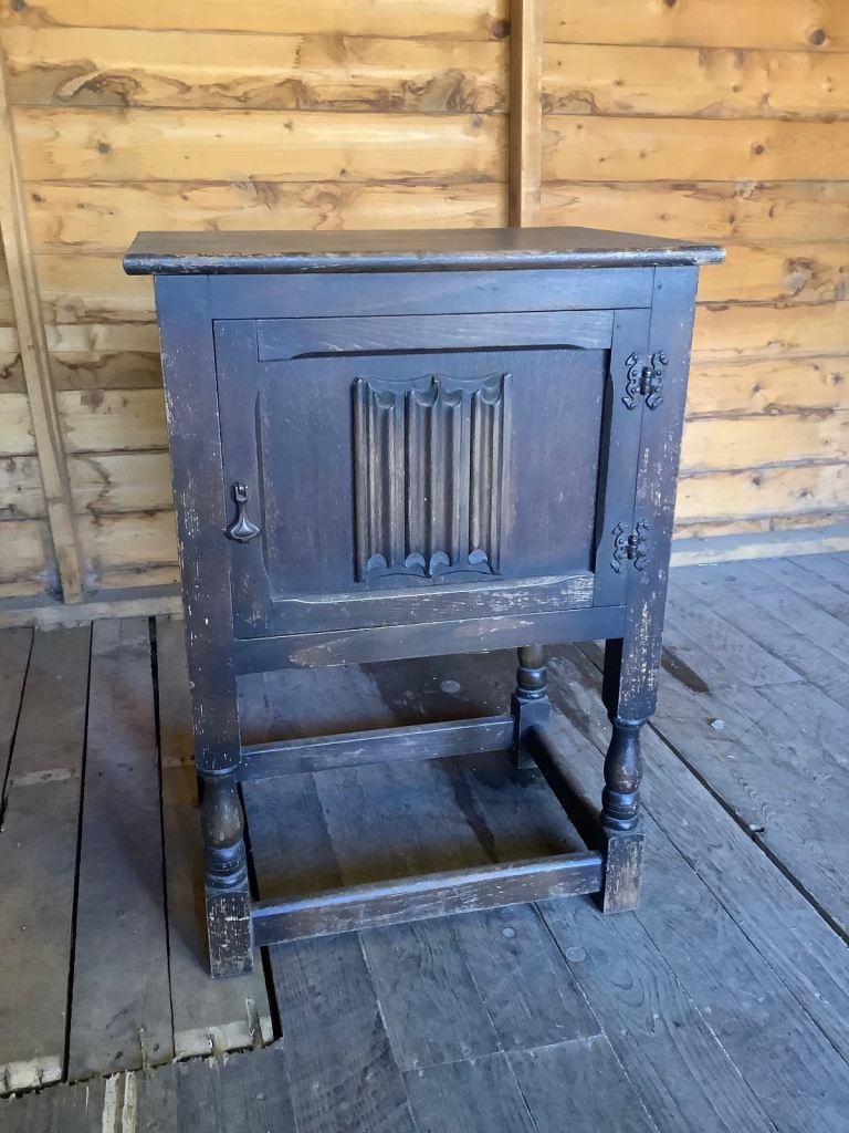 Oak old charm line fold one door, bed side cupboard with bolster turned supports it's been waxed using briwaxed as recommended, by professional furniture restorers and the cupboard is very sturdy. Size. 51cm length, 35.5cm width, 71cm floor to top, 34cm depth by 71cm high. Collection only.