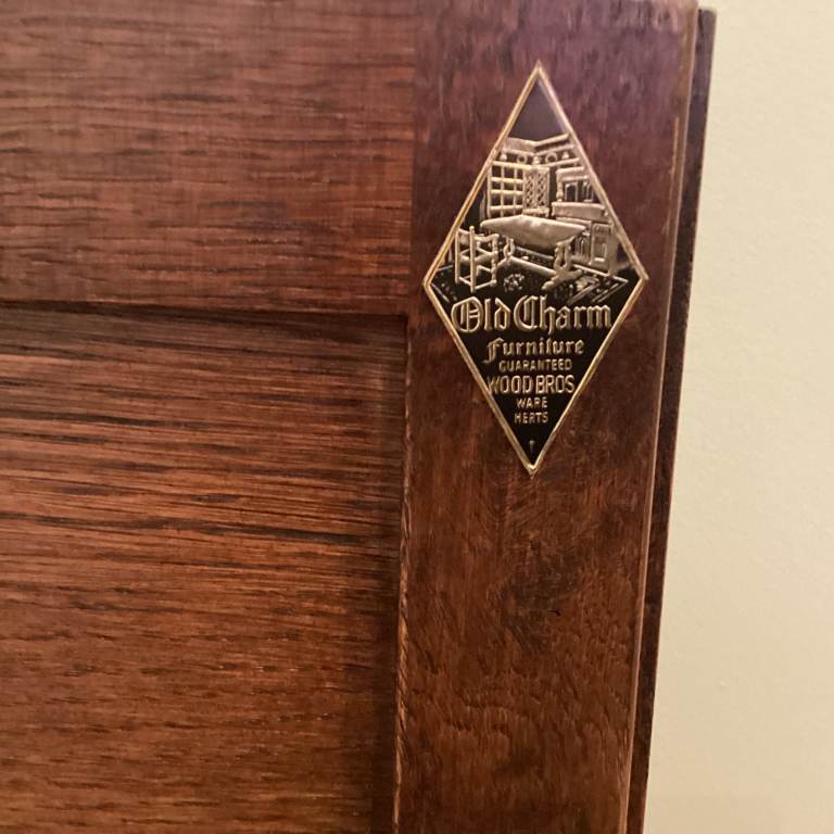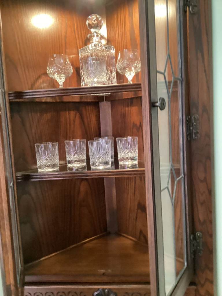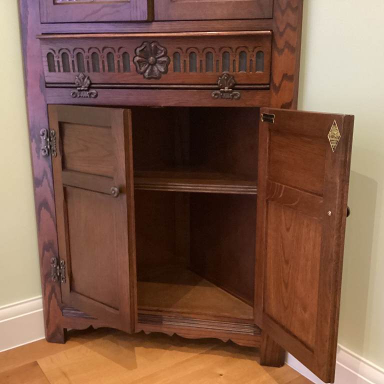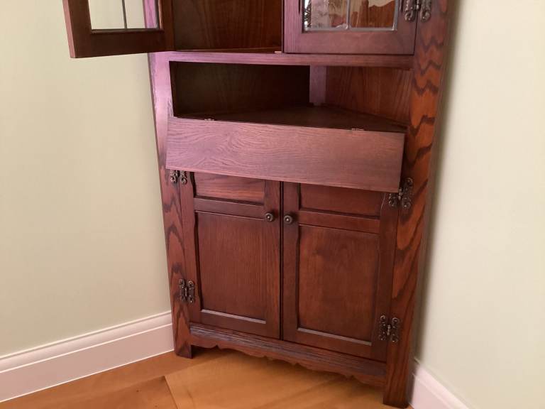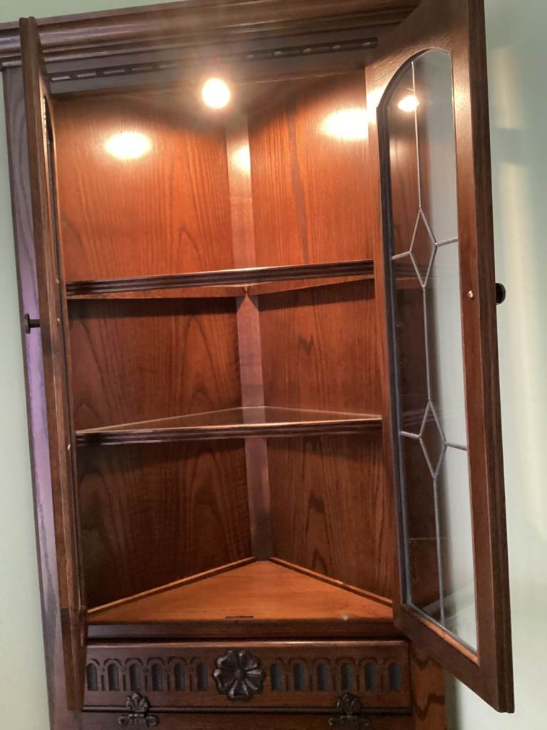 Old Charm corner display cabinet in Tudor Brown by Wood Bros. of Ware, Hertfordshire. Manufacturer's item number 2263.