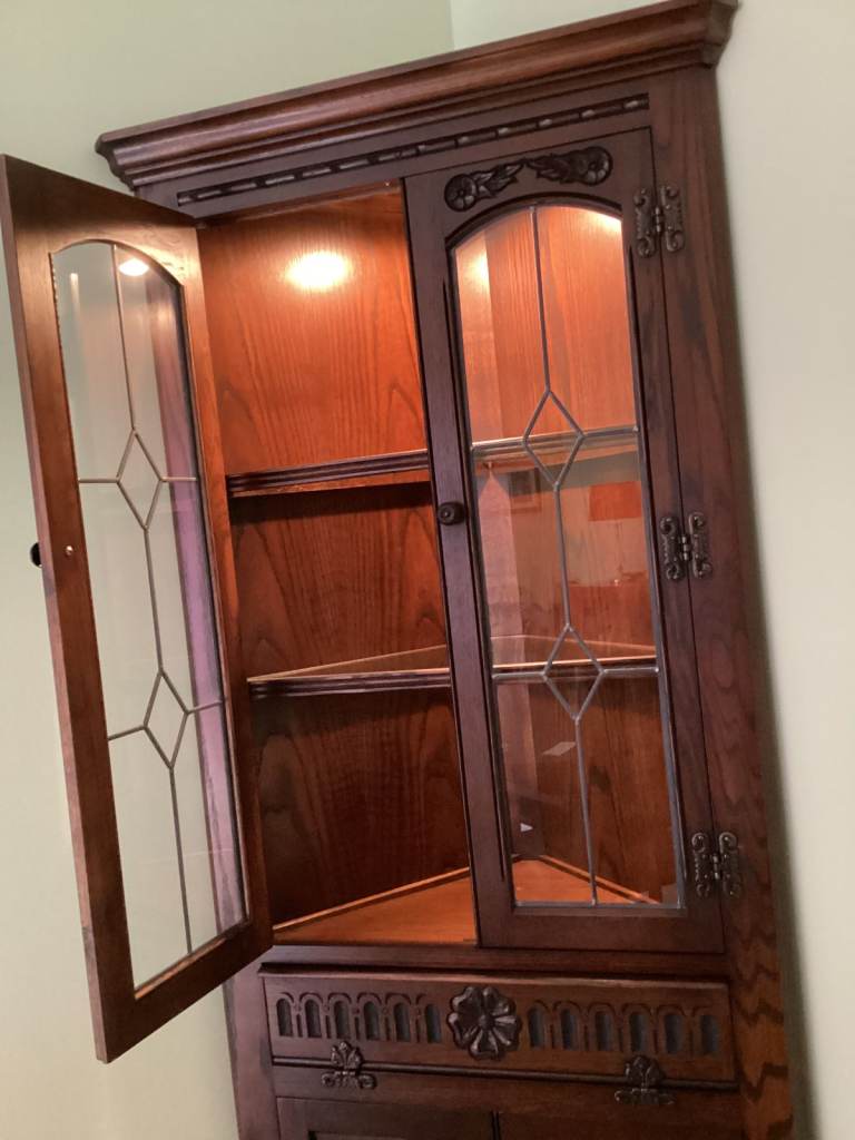 Old Charm Corner Display Cabinet by Wood Bros. Pristine, Unmarked Condition.