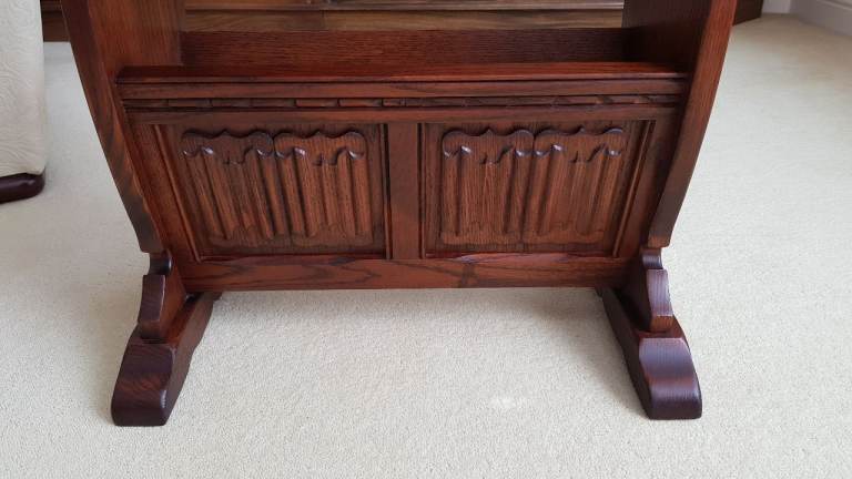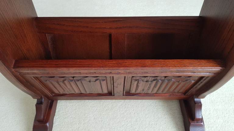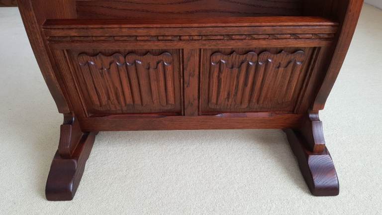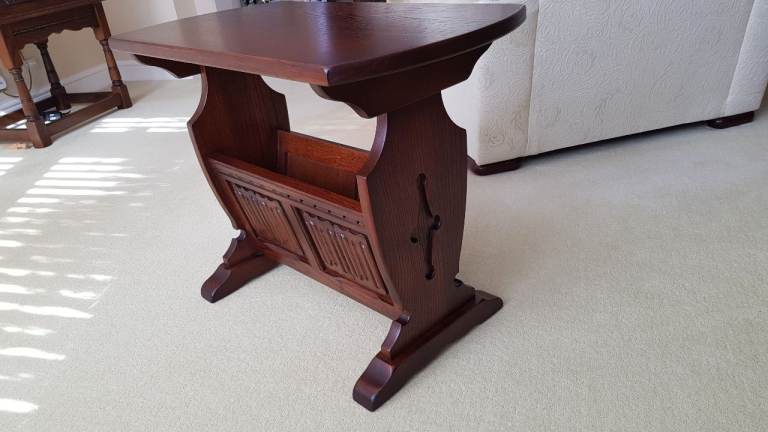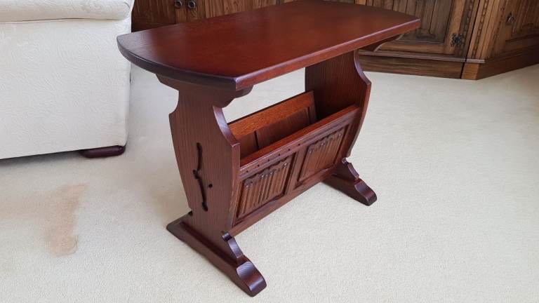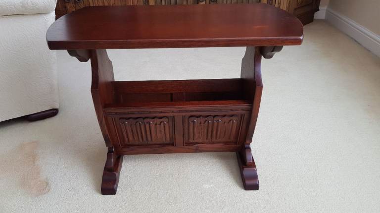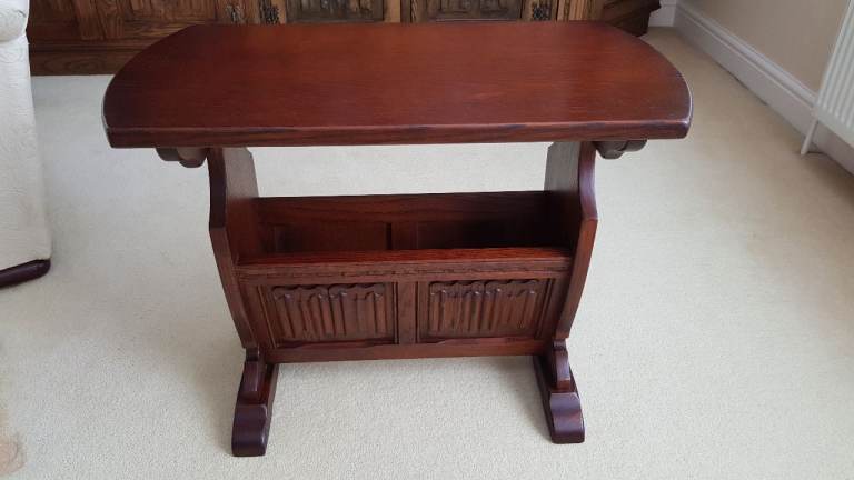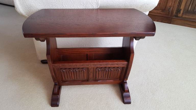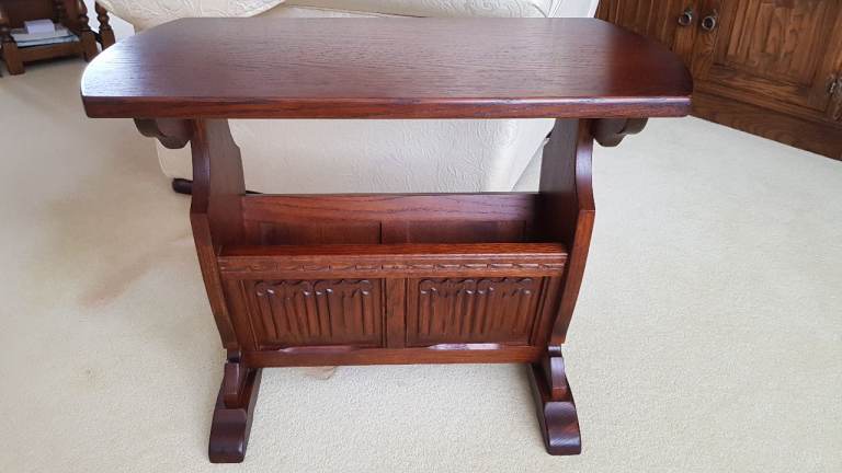 Old Charm solid oak magazine rack side lamp table with hand carved detail and linen fold panels.