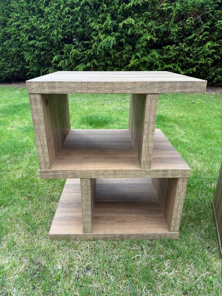 Two side tables - one long side table/small bookcase and one smaller asymmetric design.