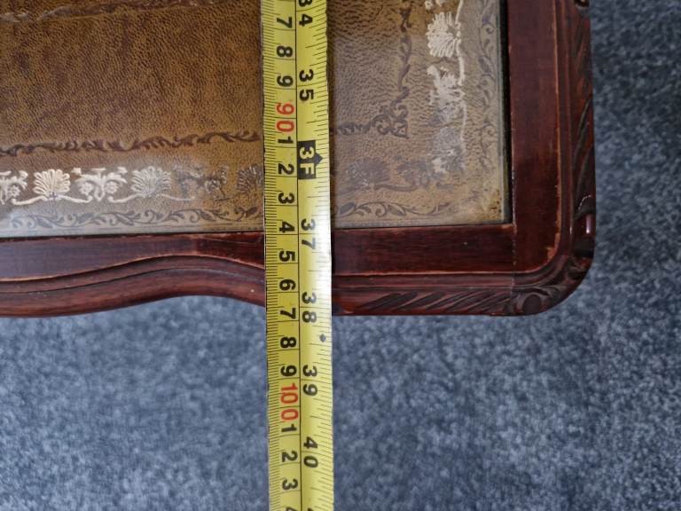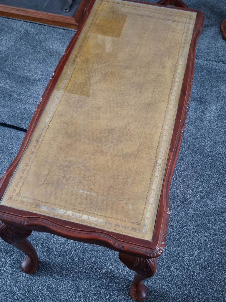 FREE Reproduction mahogany occasional table coffee table. Inlay leather the top covered with glass. A usual age-related marks as it is about 50 years old.