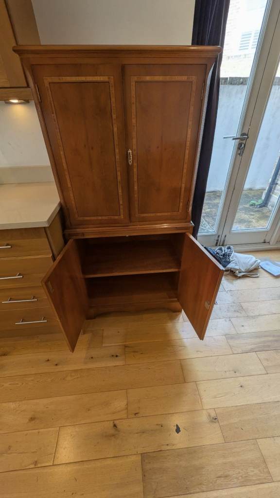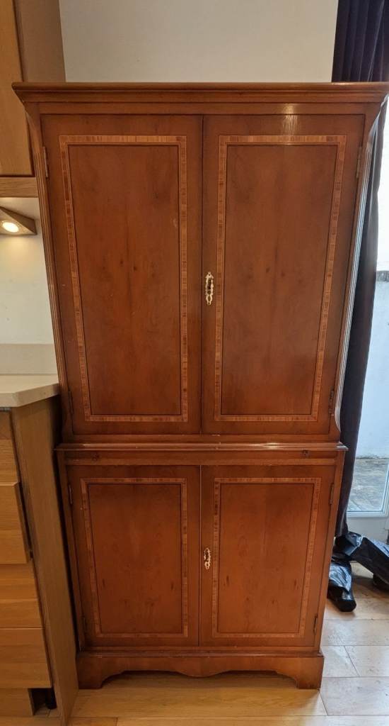 Antique style Yew Veneered Drinks/Cocktail cabinet. Good condition. Lockable opening top doors (with mirror on inside) for storing bottles, and opening lockable lower doors for glasses etc. Pick up from Brixton or can arrange AnyVan at buyers cost. 150 cm height, 73cm width and 42cm depth.