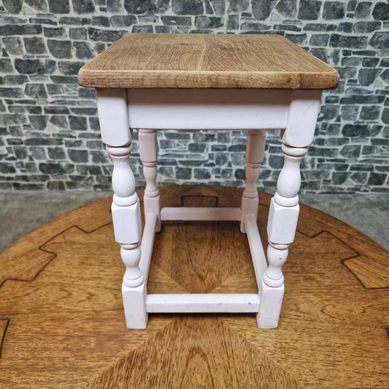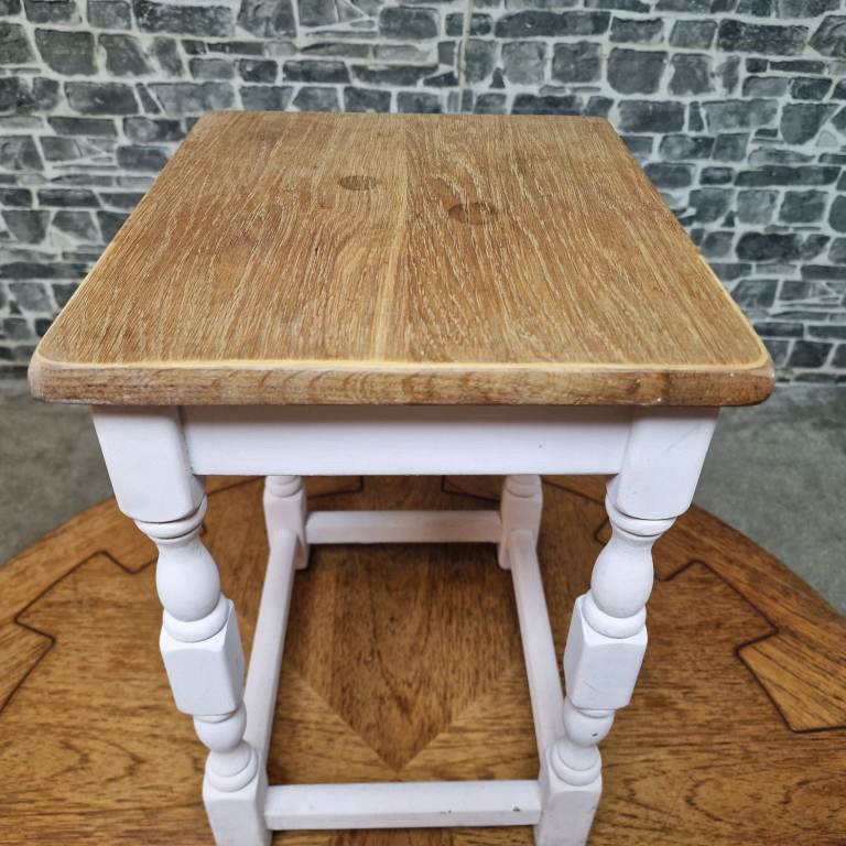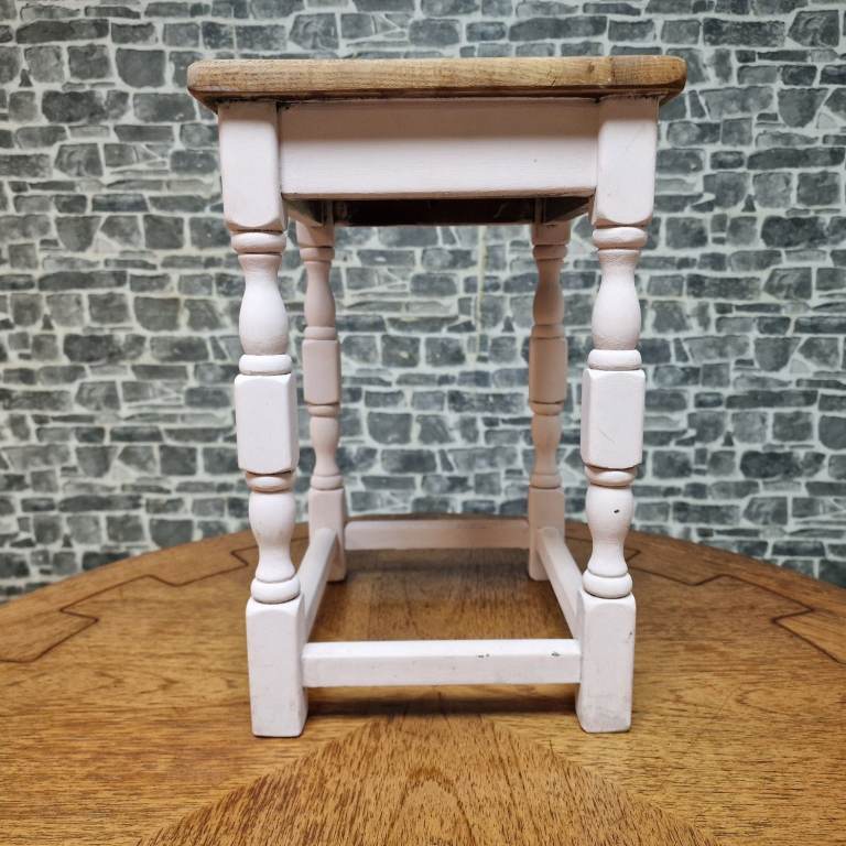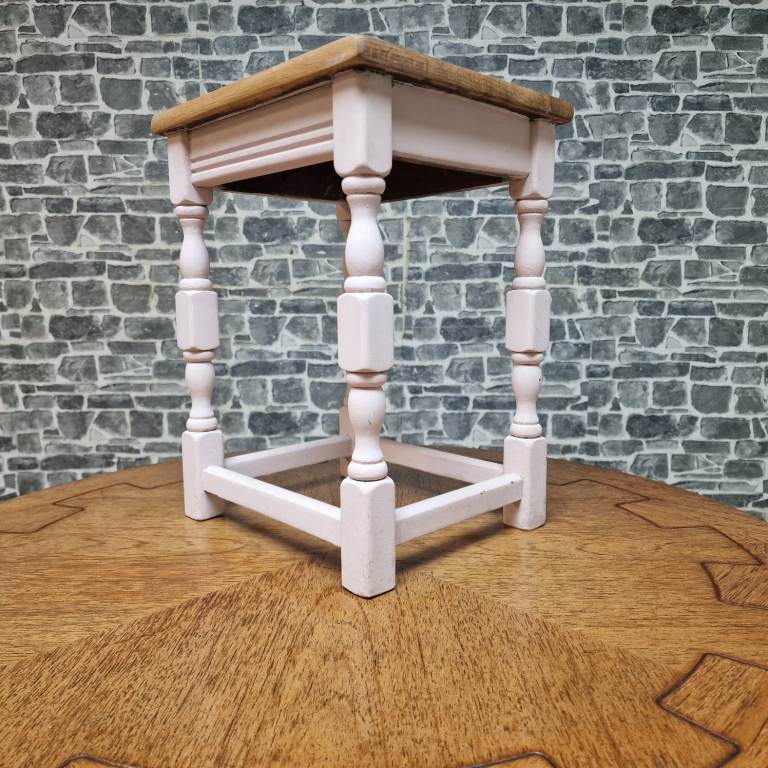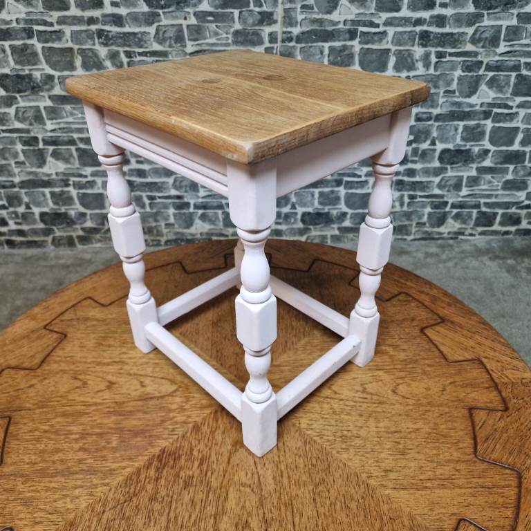 Rustic wooden side table with a natural wood top and softly painted base featuring turned legs and stretcher supports. A versatile little piece that would work well as a lamp table, plant stand or bedside table. Simple country-style look with plenty of character. In good condition overall with light signs of use consistent with everyday use. Dimensions: L 32 x D 27 x H 41 cm