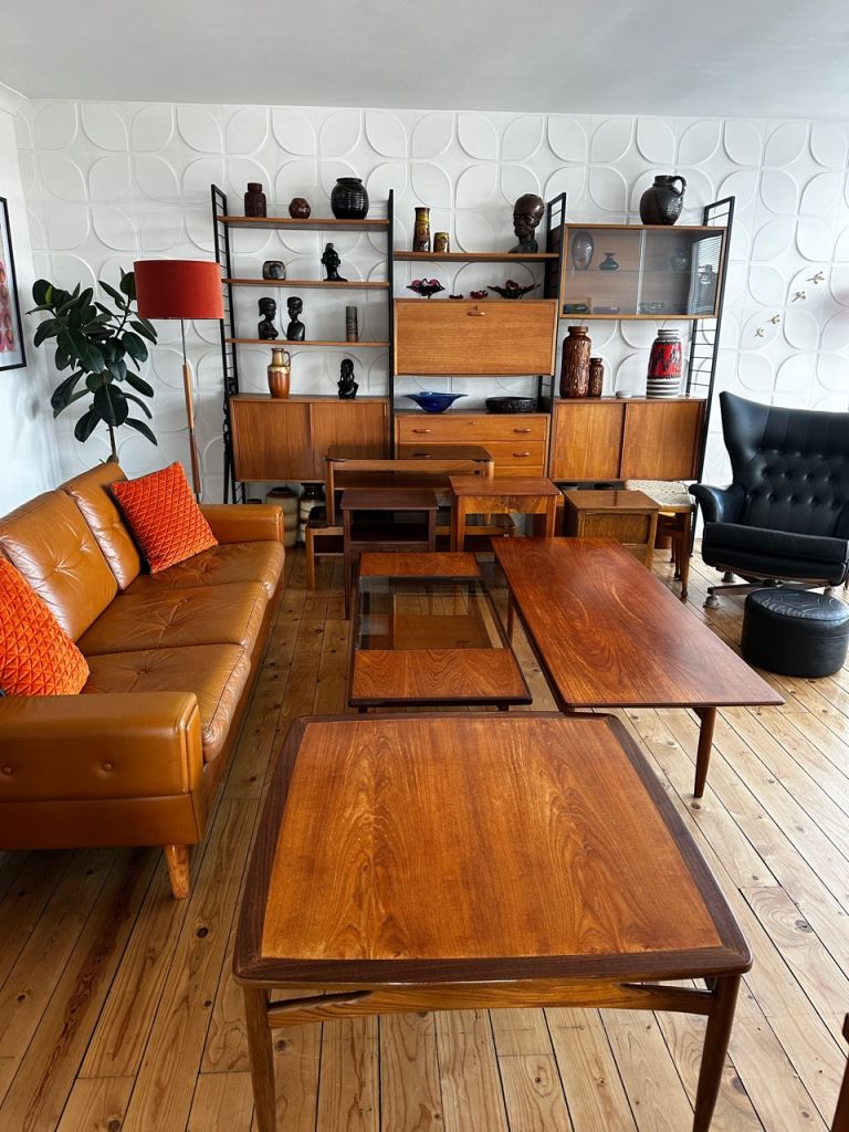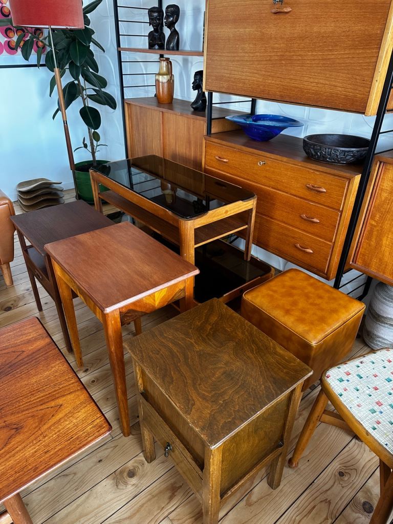 Coffee tables...... G Plan long john. G Plan square coffee table. Long glass topped Myers. Shorter glass topped Myers.