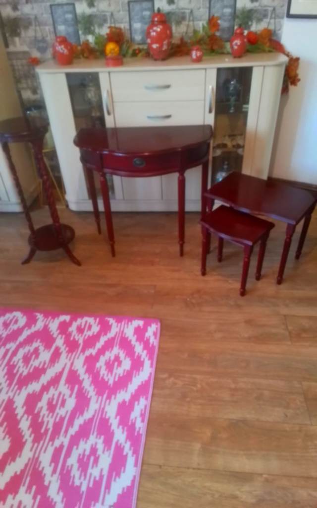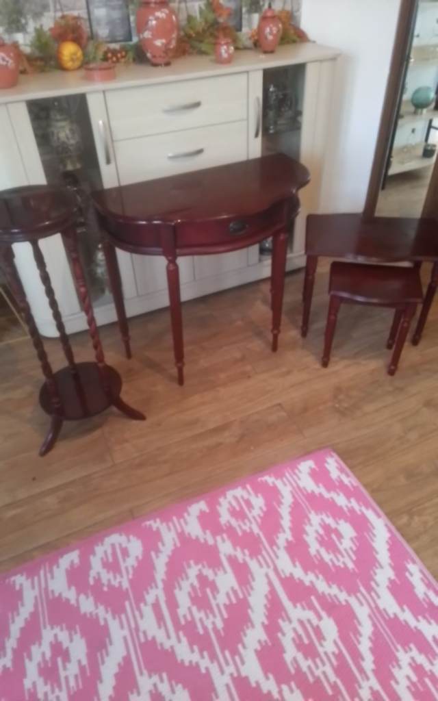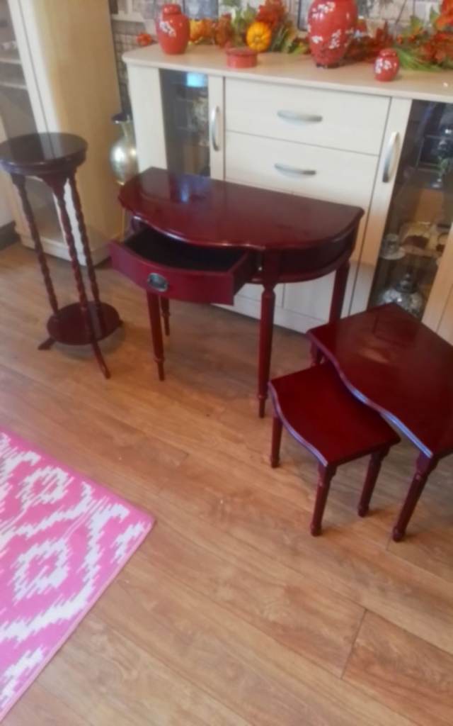 A very stylish set of 4 good quality "CLASSIC "style tables in very good condition, -A half moon console table with drawer, a tall circular 2 tiered plant table with barley twist legs, and a matching nest of 2 tables, a really smart good looking set, cash on collection from Wigan please or may be able to deliver for cost of fuel only thank you.