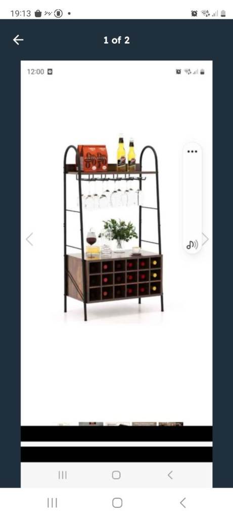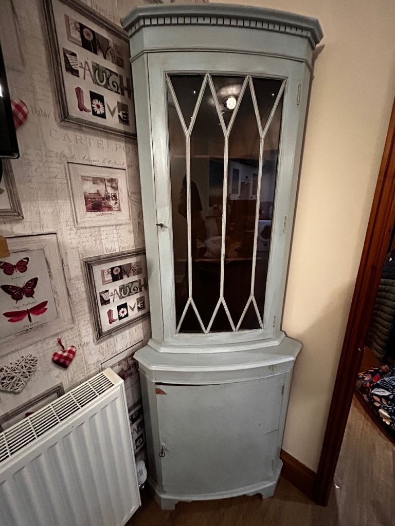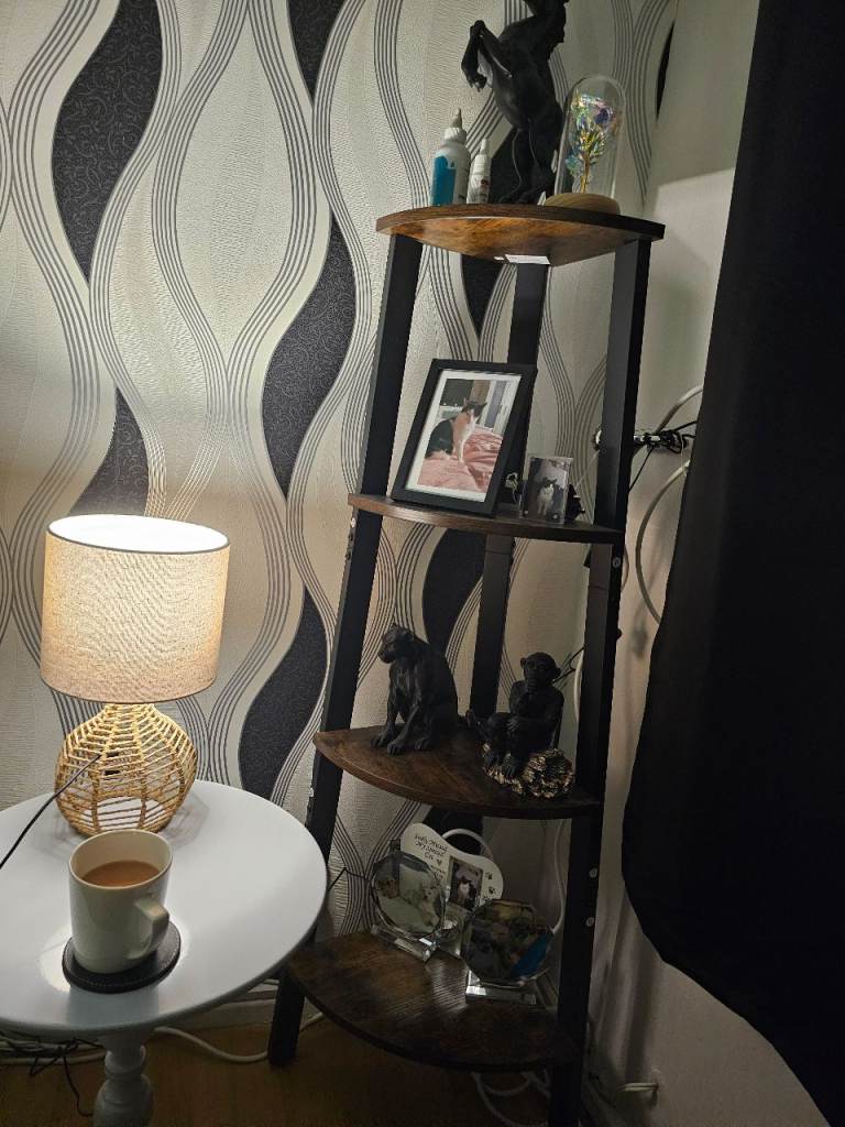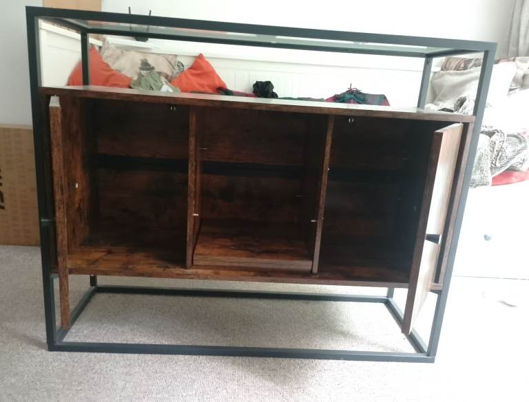 Dark wood effect , internal shelves , glass top . Pick up .