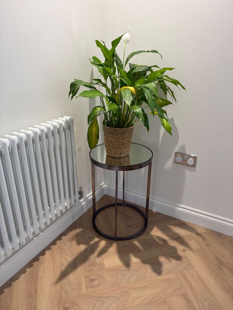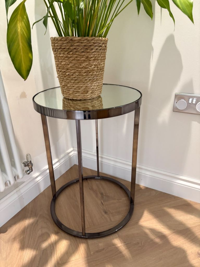 2 x lovely round side tables. Mirrored top with lovely pewter coloured base. Cost £260 will accept £80 for both. Lovely tables for lounge.