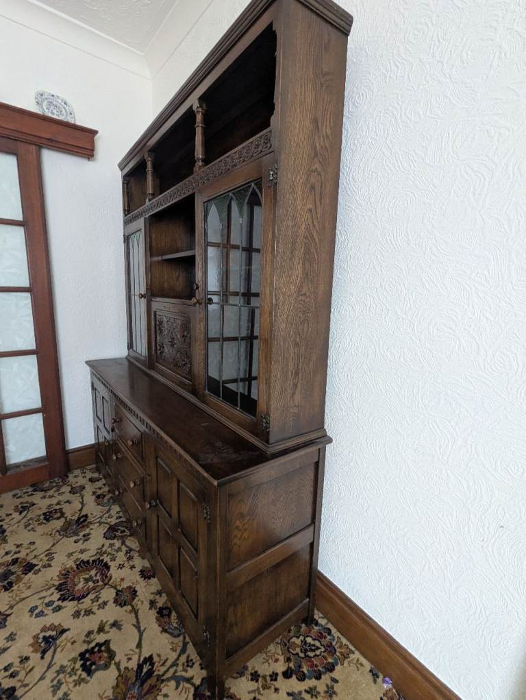 Solid oak sideboard and display cabinet.
