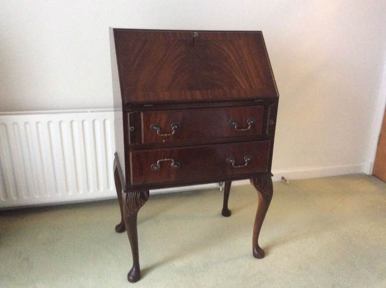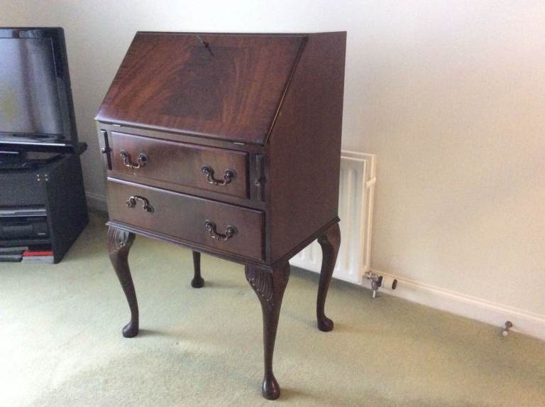 Small writing bureau,dark.wood veneer,two storage drawers, key present.