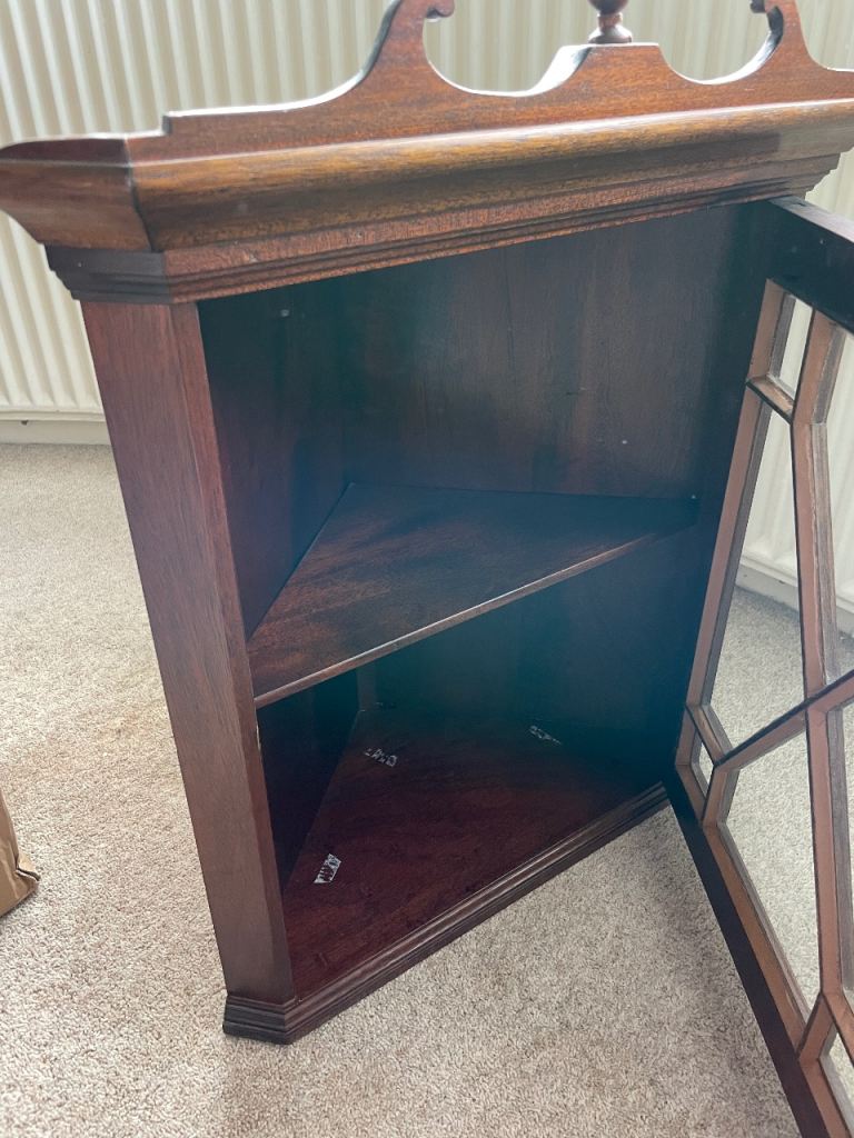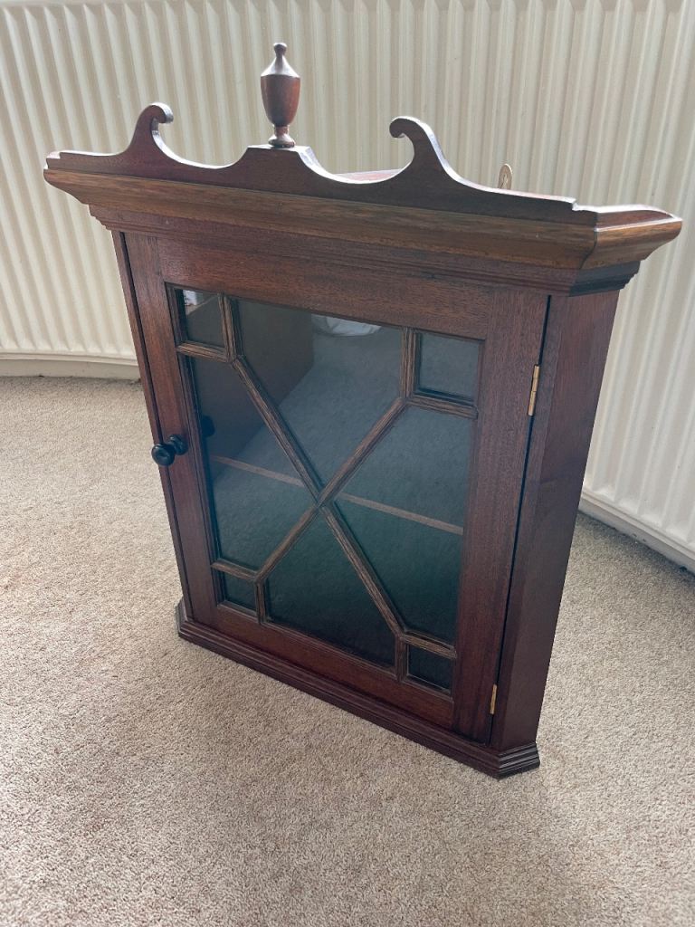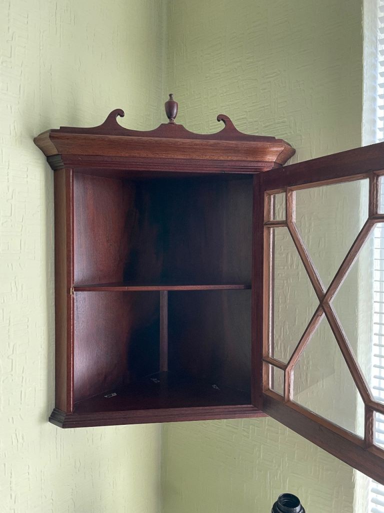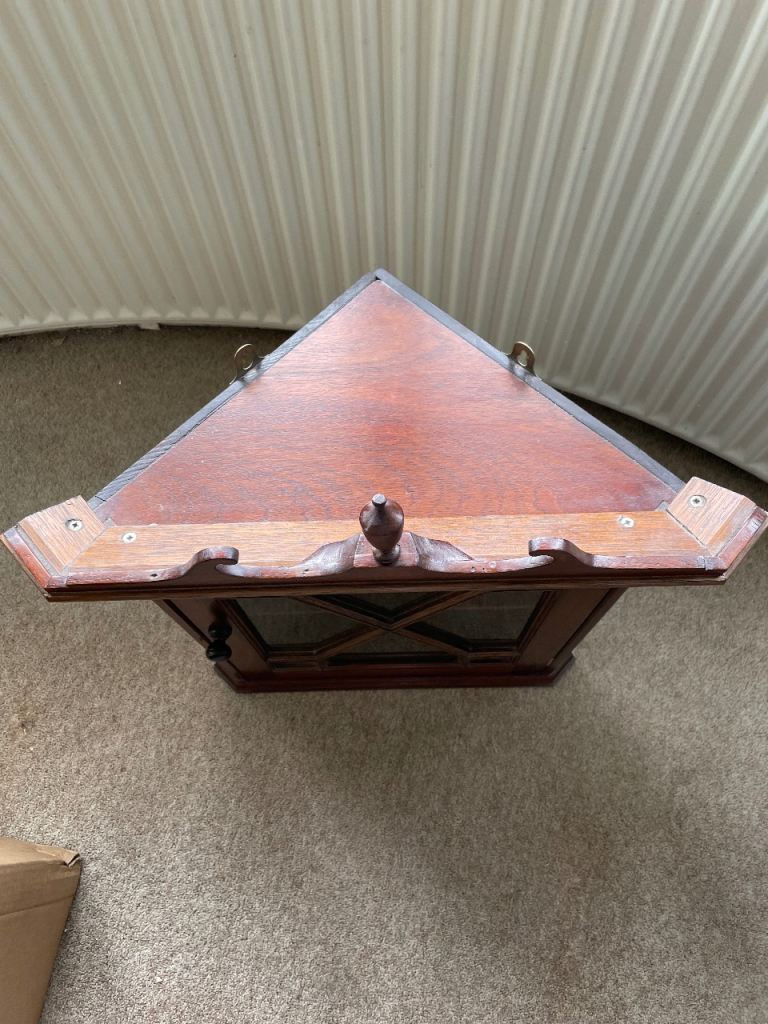 Posting for 1+ monthsSmall vintage wooden corner unit with glass door and single shelf