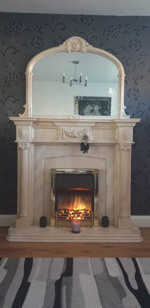 Solid marble effect fireplace. Includes surround, hearth, electric inset fire with heating & mirror