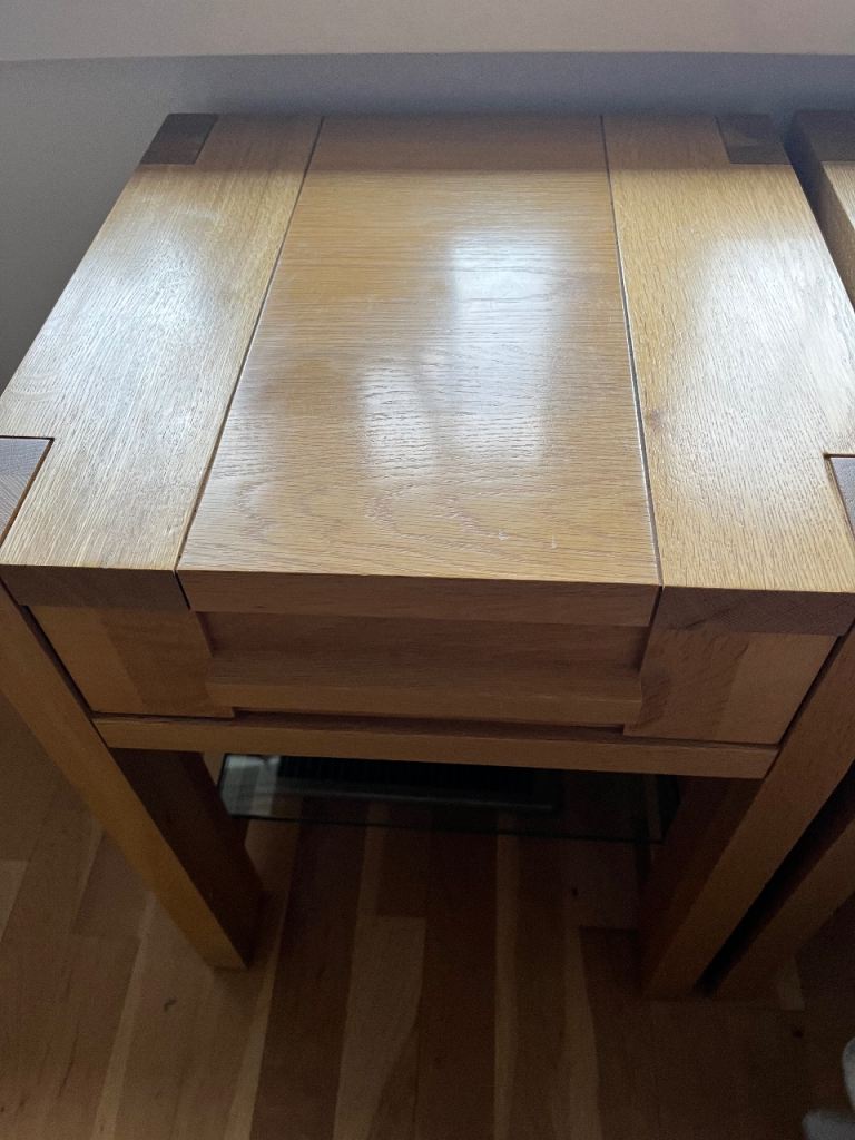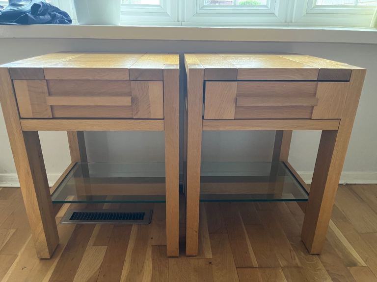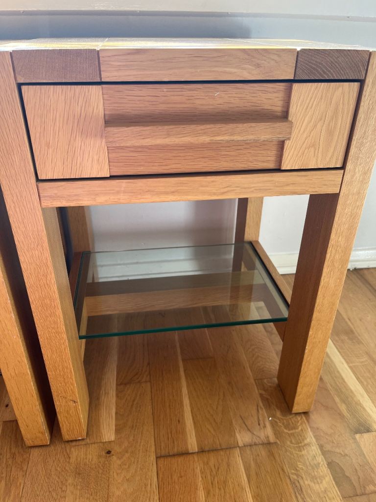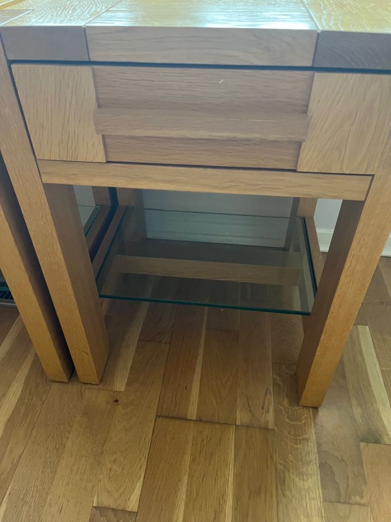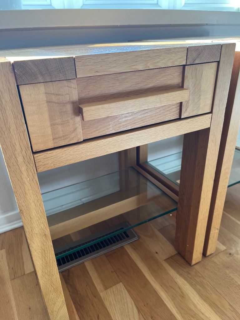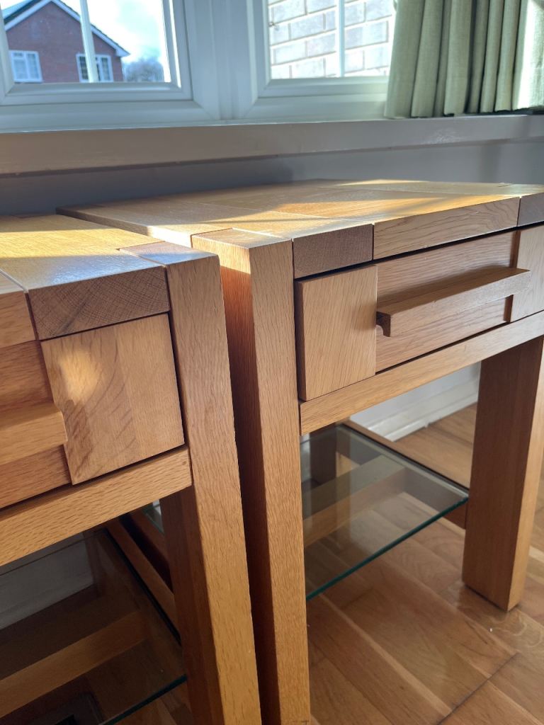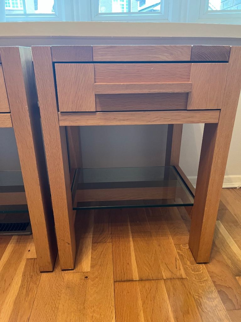 Posting for 10+ yearsSolid Oak Side Tables – Matching Pair - Drawer & Glass Shelf
