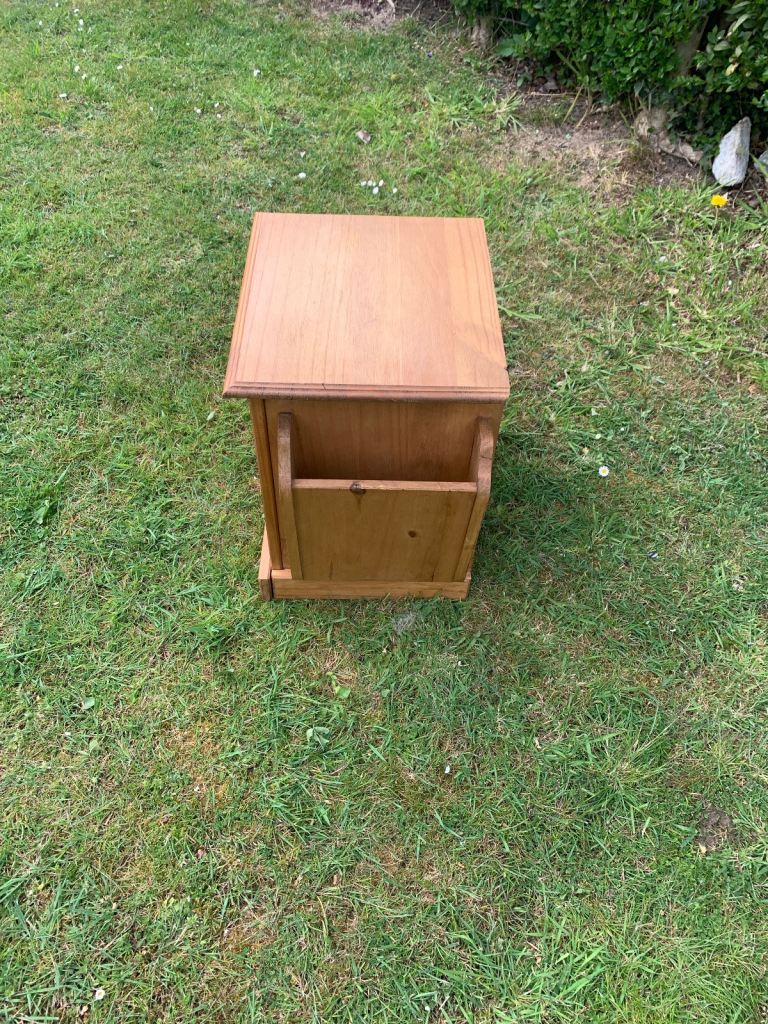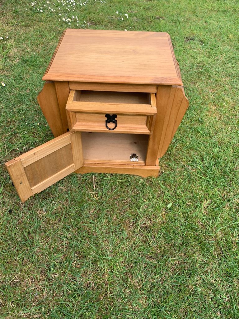 Solid pine side table with cupboard, draw and magazine rack