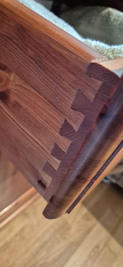 Solid wood, dark antique pine dresser and separate cupboard (2 pieces of furniture). Dovetail joints on drawers.