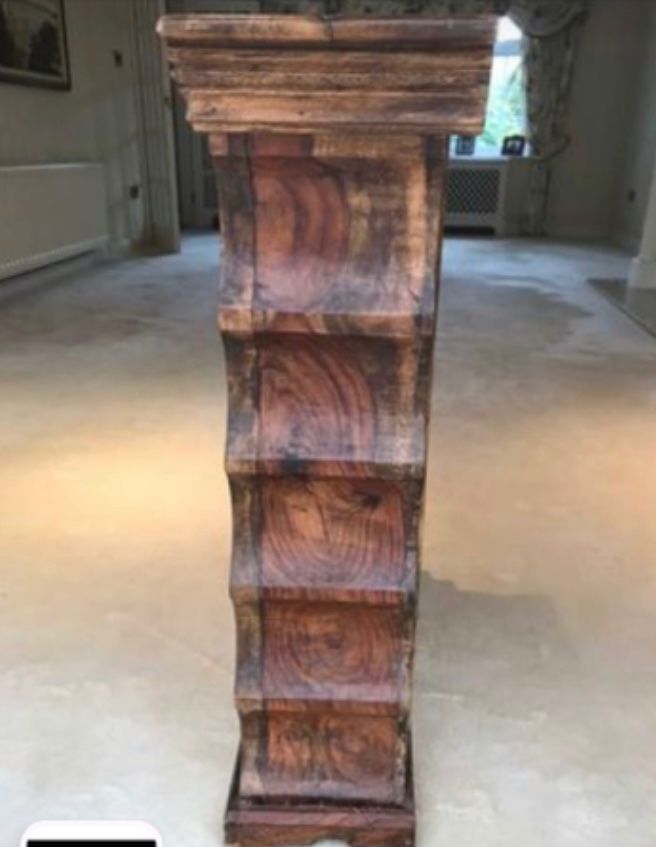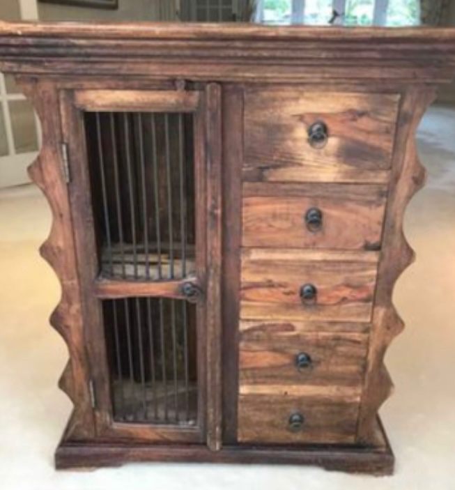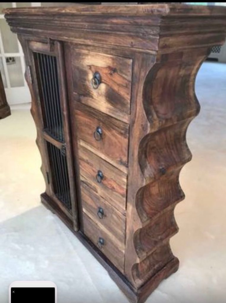 This richly detailed solid wood side display cabinet with wrought iron portcullis work, tapered cornice, carved sides - has been handcrafted from sheesham wood and finished with a wax lacquer to bring out its subtle variations in tone and distinct grain patterns.