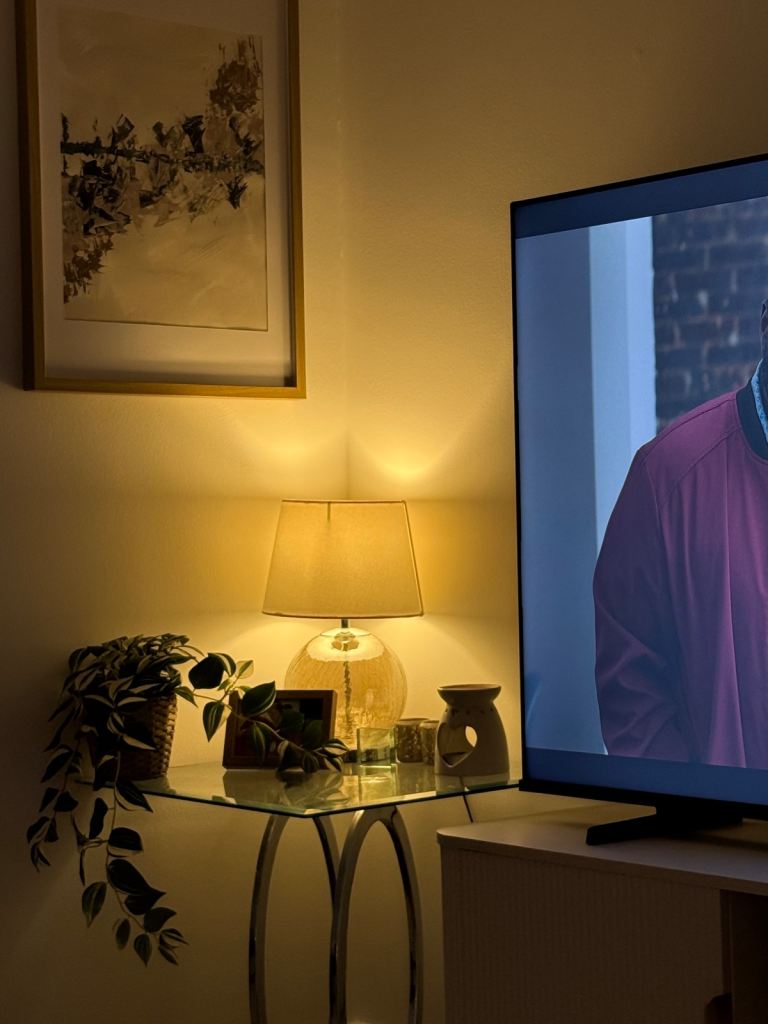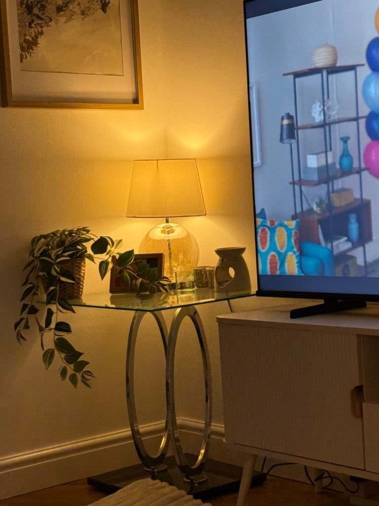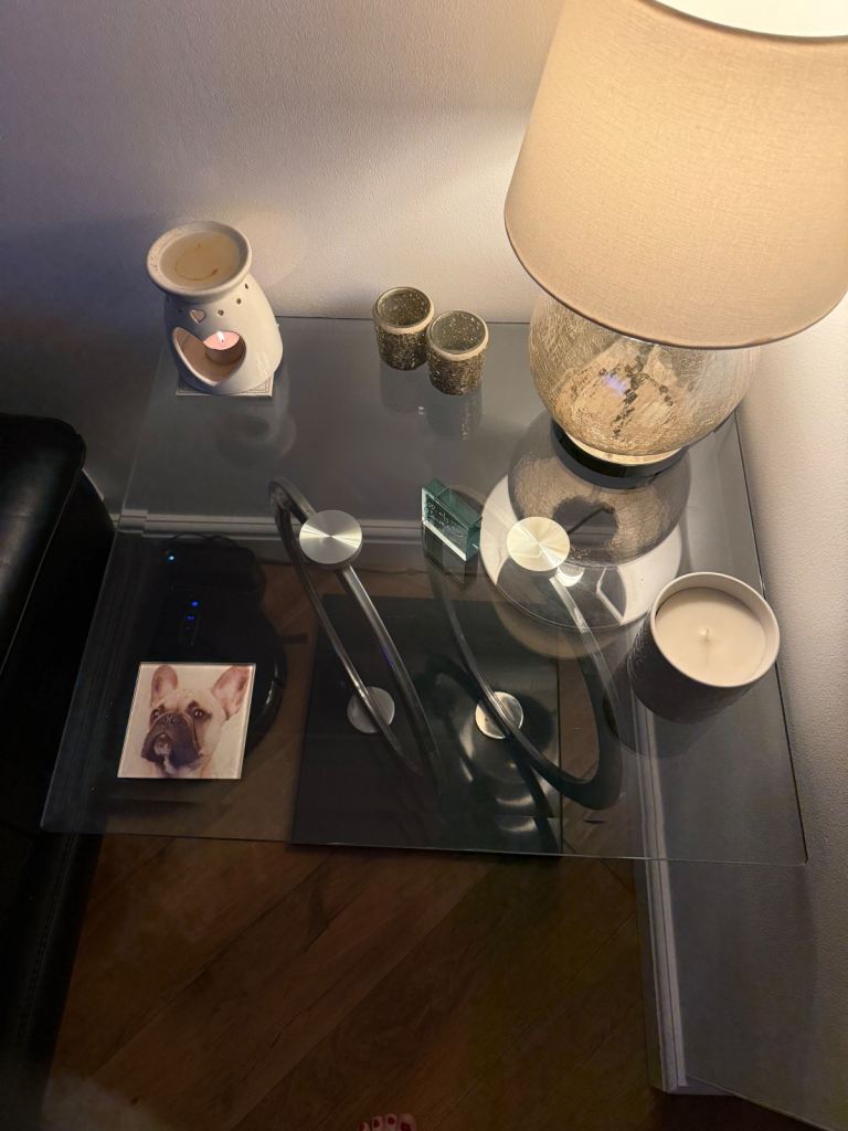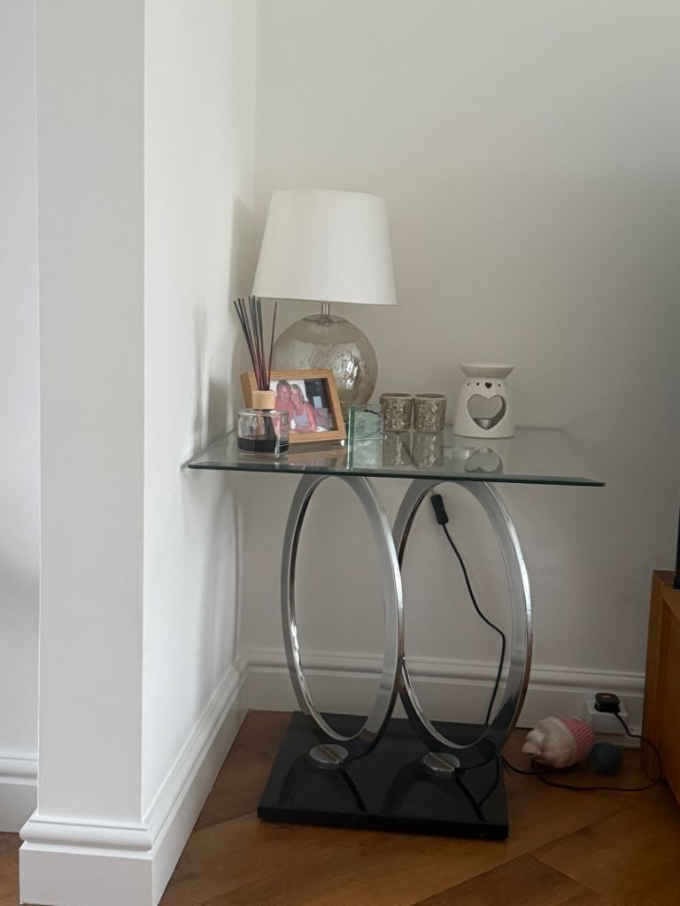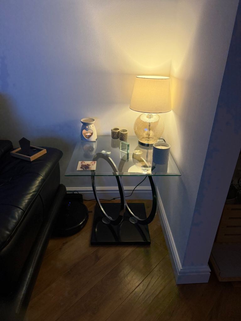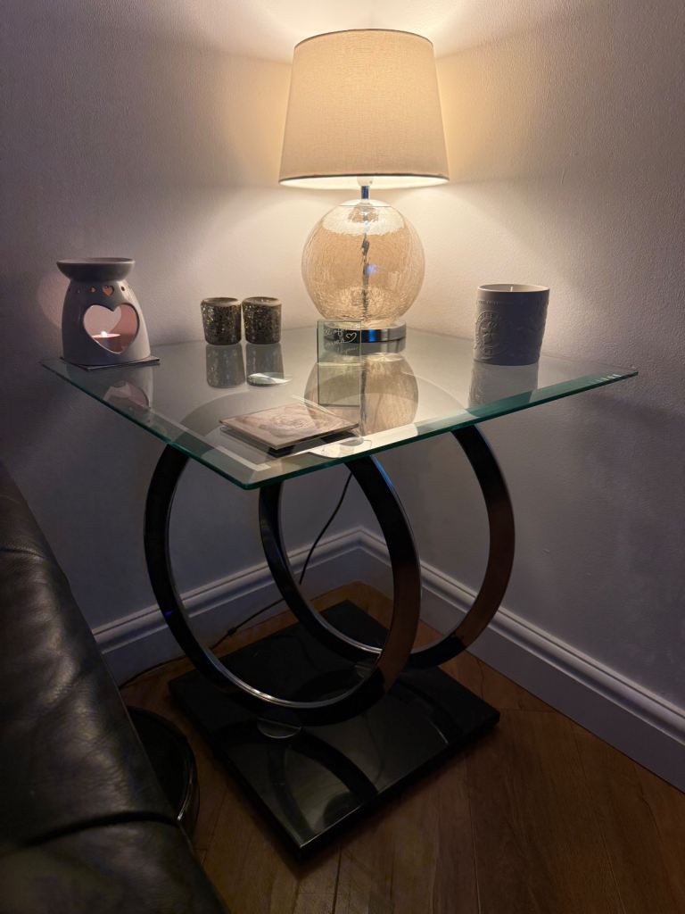 Glass side table in great condition. Collection only Renfrew.Black base with metal circle stands.lovely table.