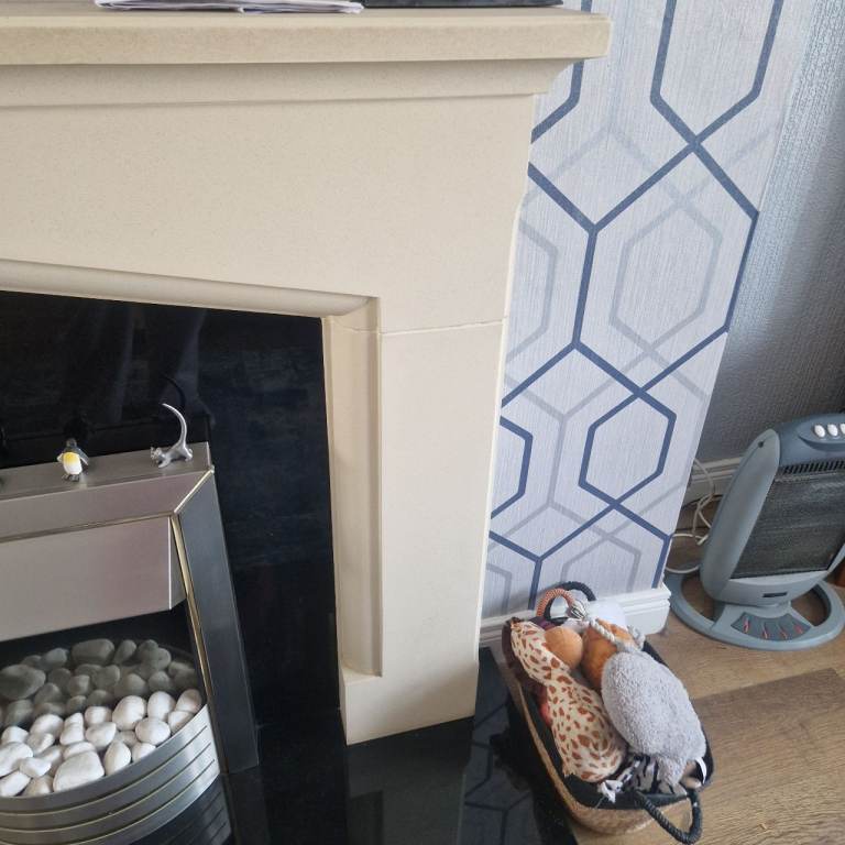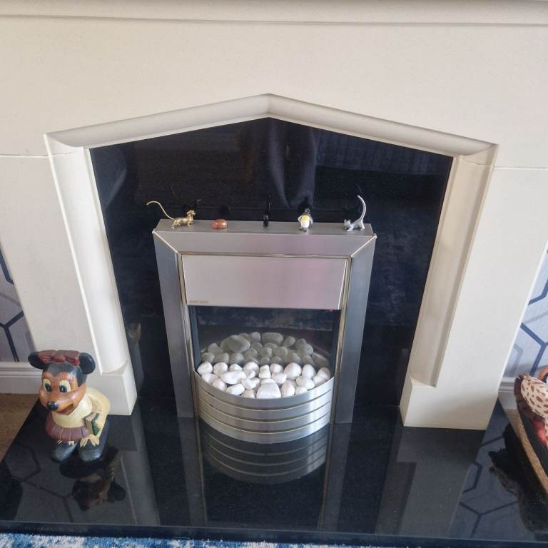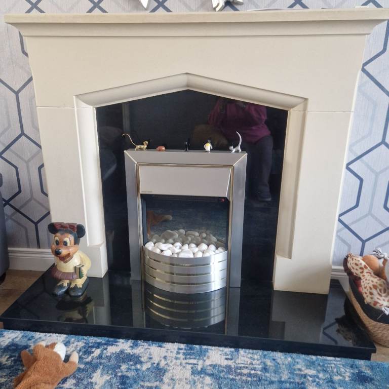 Beautiful Cream Stone Fireplace with black marble hearth and back surround. Electric inset fire perfect condition. Fireplace in great condition. This will be getting dismanteled on 1st March