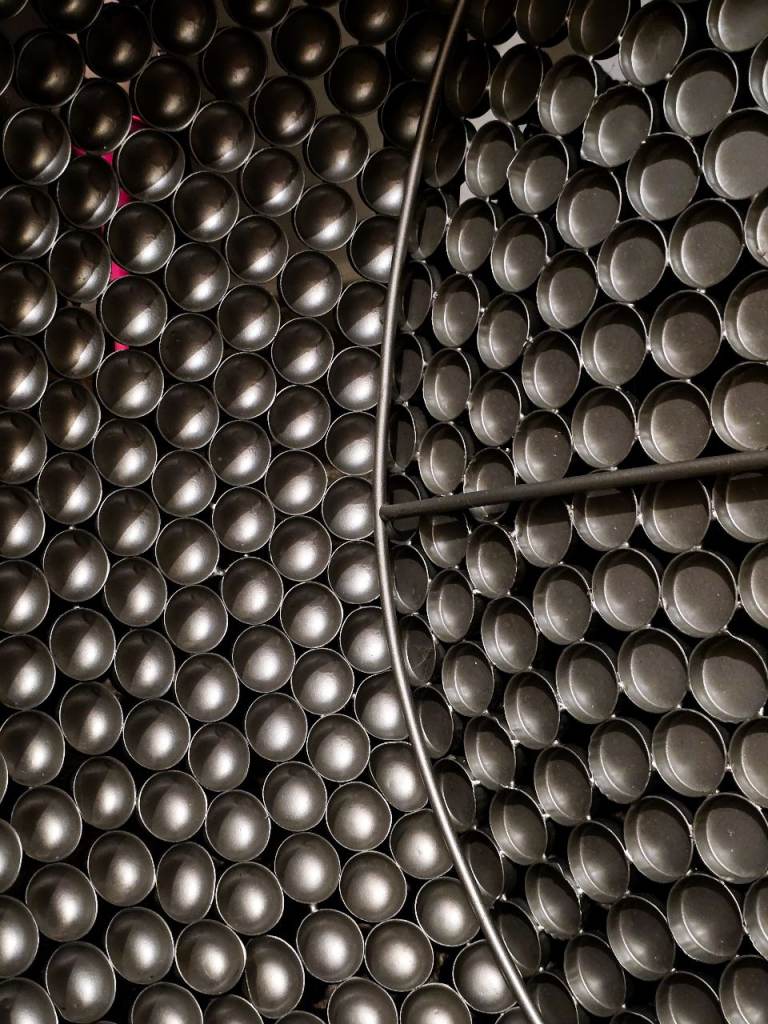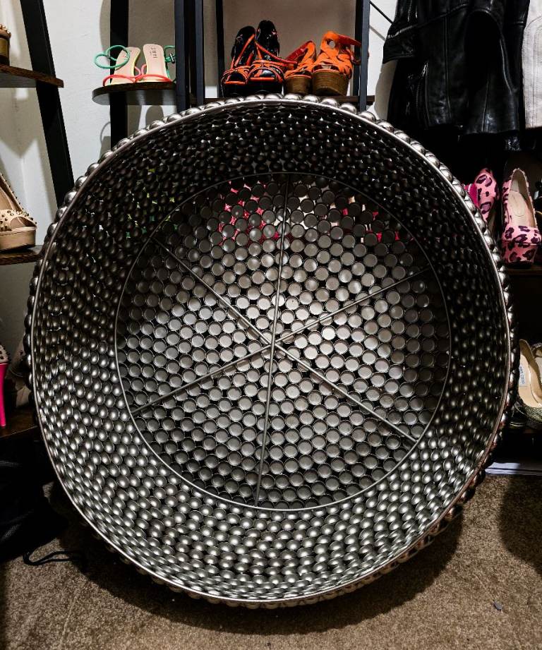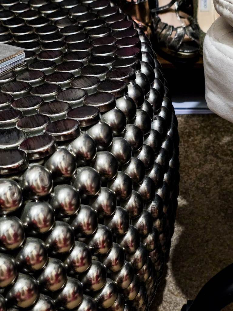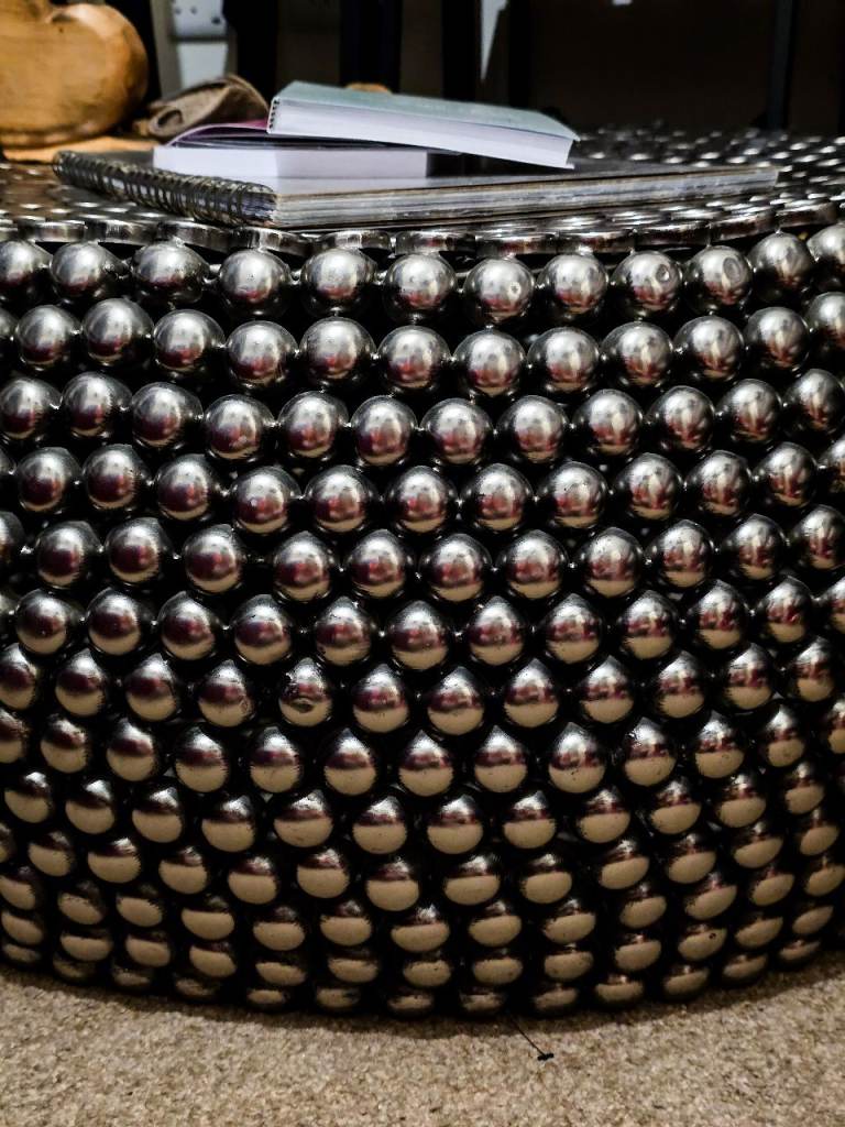 A stunning statement coffee table featuring an all-over silver/pewter dome design. This is a quality piece with proper handcrafted construction - each individual dome and disc is hollow metal, individually welded together. Substantial and solid but not ridiculously heavy thanks to the hollow construction.