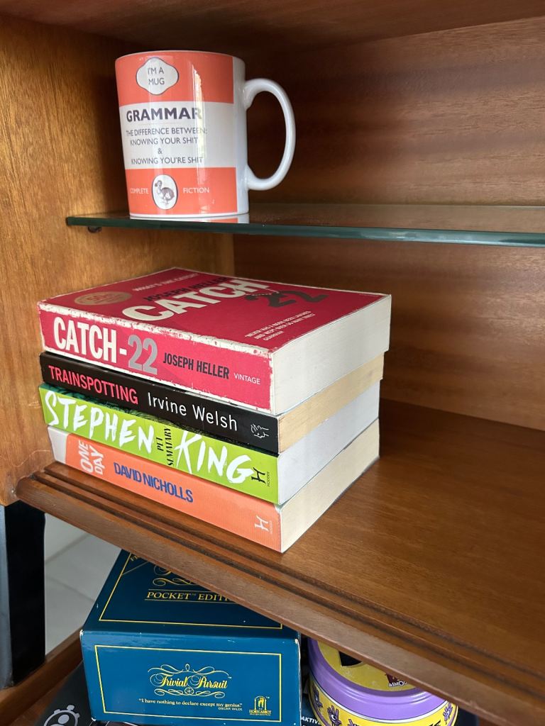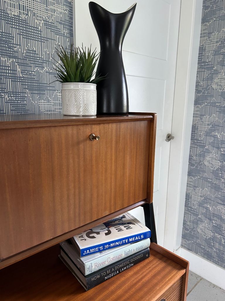 • On the left, a drinks cabinet with sliding glass doors and a single glass shelf, perfect for displaying glassware or bottles.