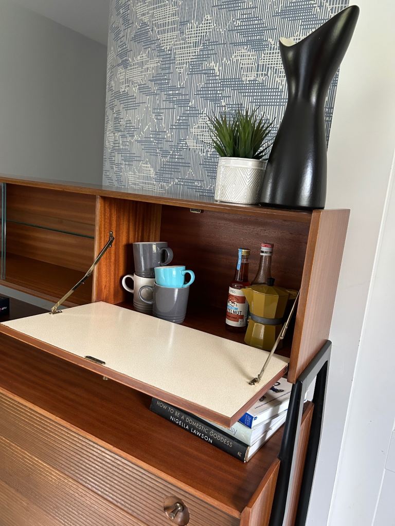 • On the right, a drop-down cupboard door, finished internally with white melamine, creating a handy surface for mixing and serving drinks.