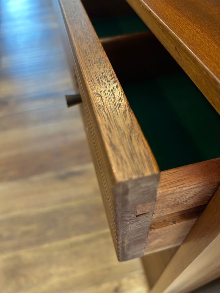 Some minor signs of wear that you have to expect with any vintage pieces. There is a small pen ink stain on original green felt of drawer.