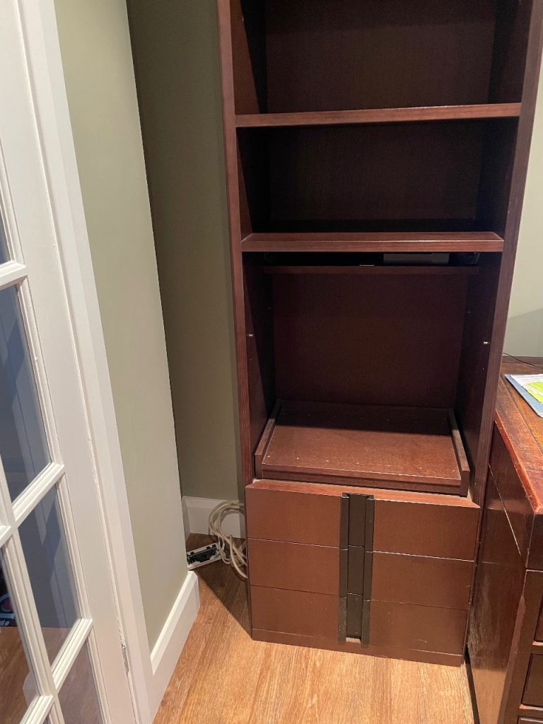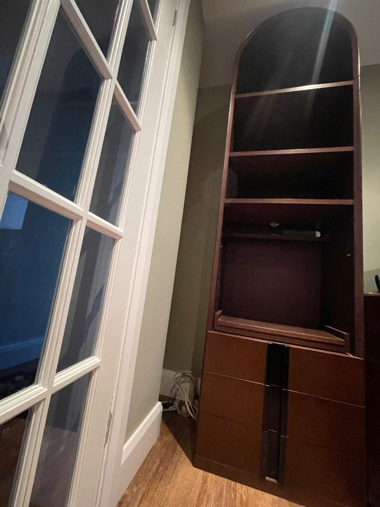 Lovely solid wood cabinet by German designer. Arched top with shelves and pull out section for hi fi if required with 3 drawers below. Matching TV cabinet also available