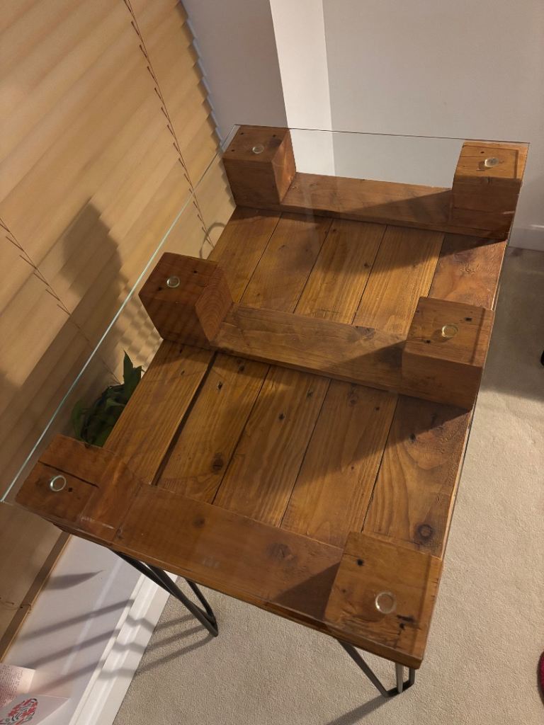 Wooden pallet table with reinforced glass top and black metal legs
