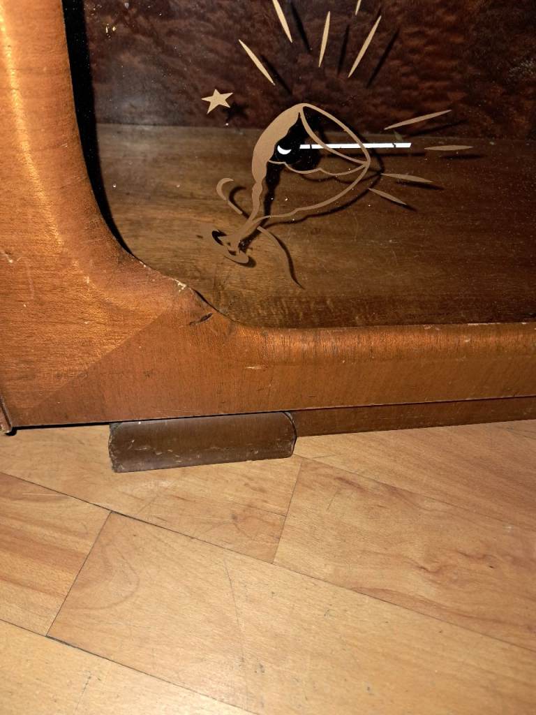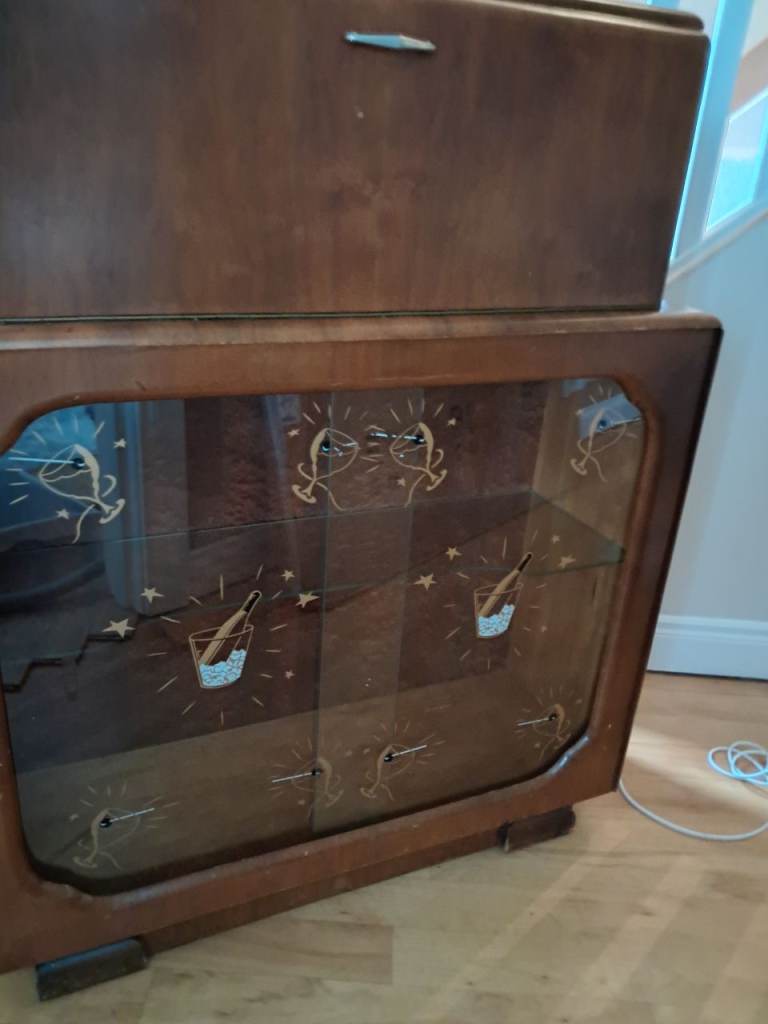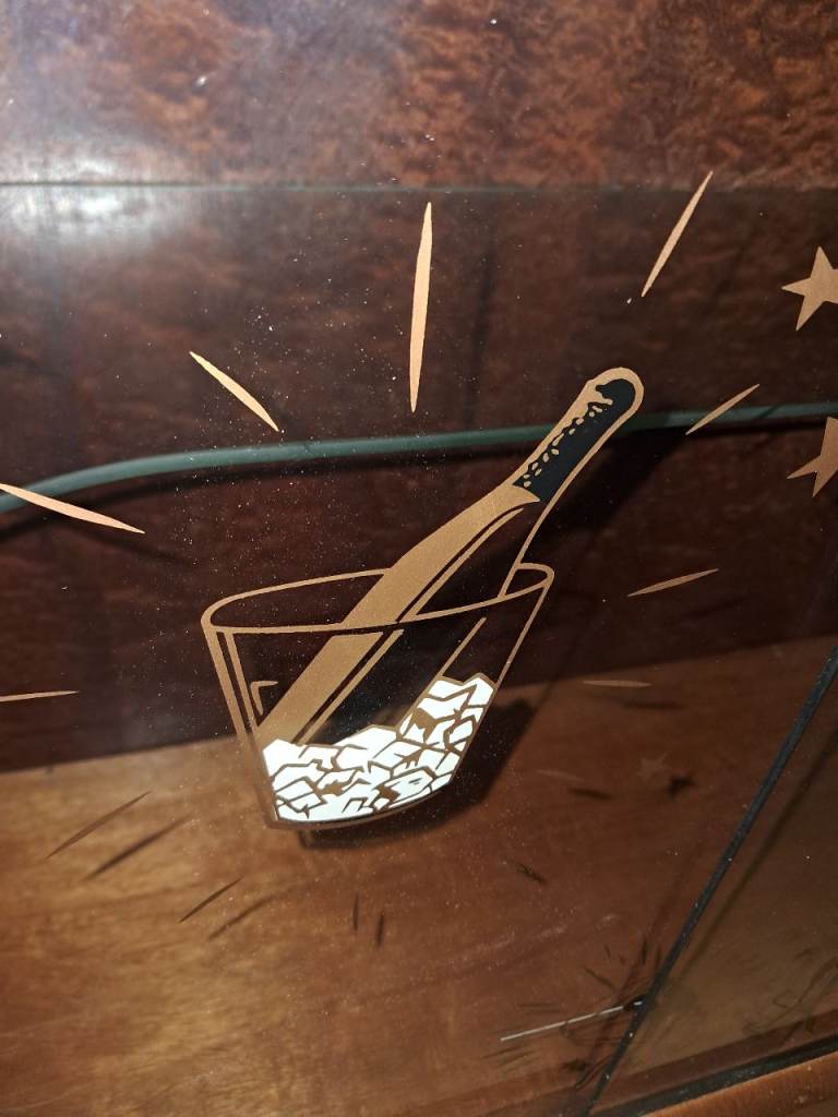 Its hard to part with this fantastic statement piece with beautiful wood grain, mirrored interior panels and classic cocktail-themed detailing. The cabinet lights up when opened and still has its original cocktail accessories, which is increasingly hard to find.