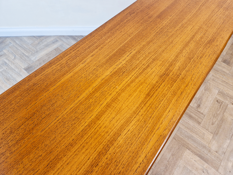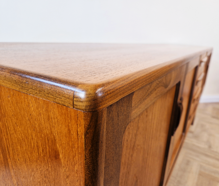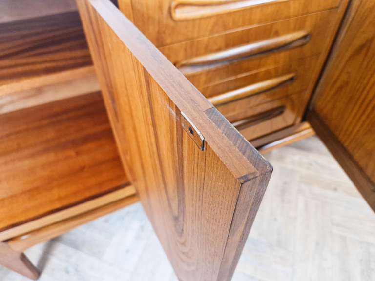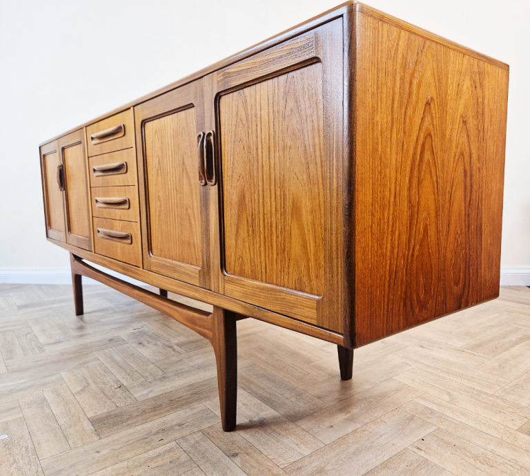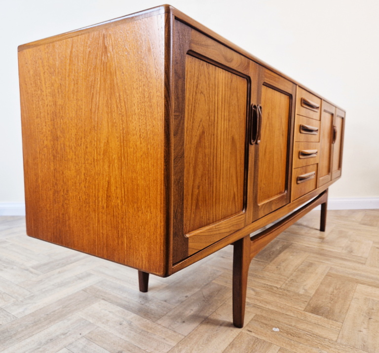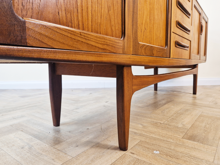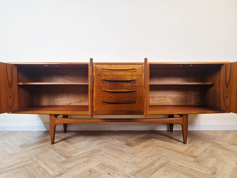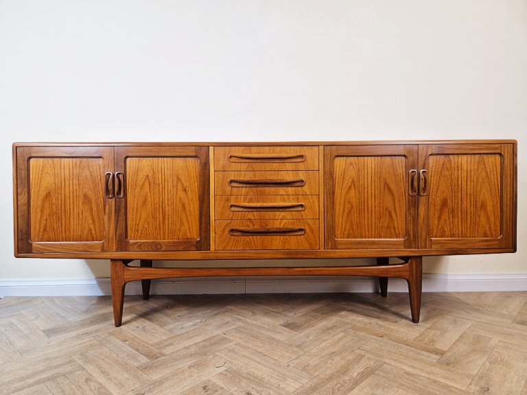A stunning and spacious mid-century sideboard from G-Plan's premium range. This exceptional piece boasts abundant storage, showcasing the brand's iconic full-length solid teak handles set against a premium teak frame. The elegantsolid teak arched plinth base adds sculptural flair, while the clean lines and rich wood grain exemplify timeless 1960s design. A true statement piece for discerning collectors.