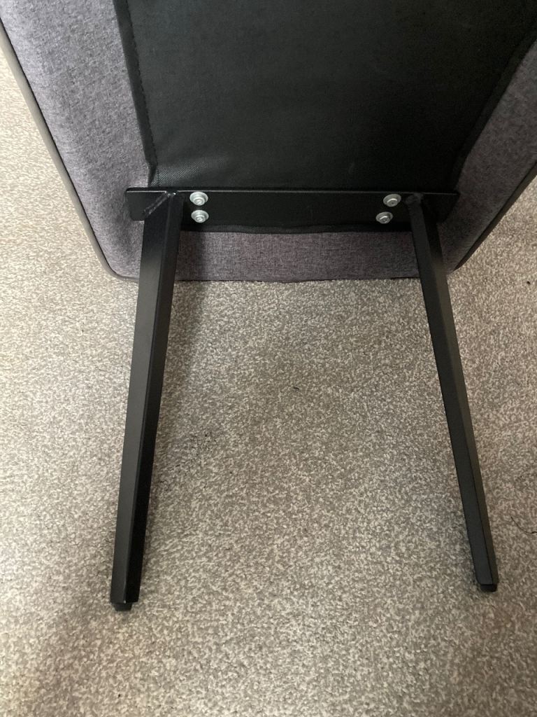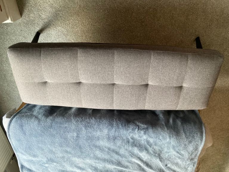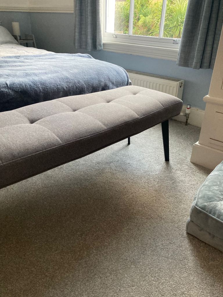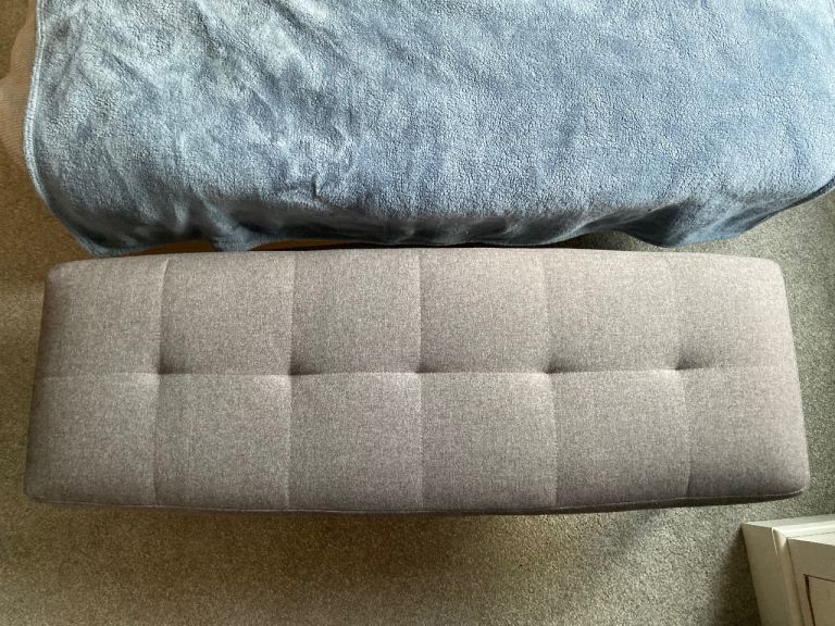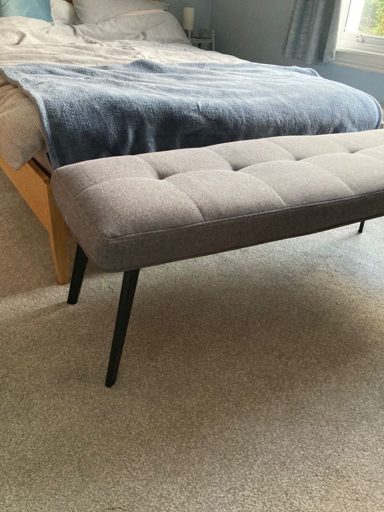 Good as new, sturdy bench used as end of bed bench currently but high enough to be a table bench or hallway bench. Grey material with black legs.