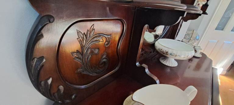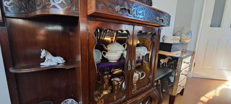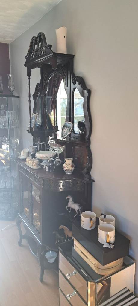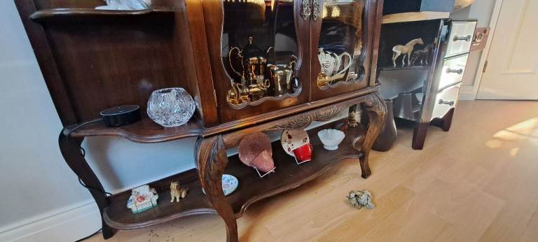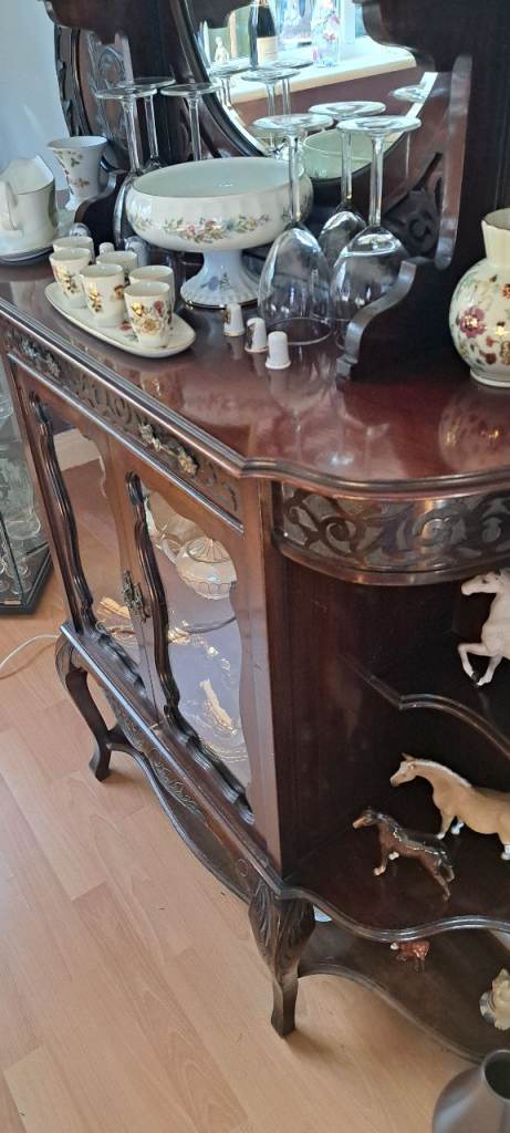 Please note ornaments shown on display cabinet are not included in the sale. A bill of sale from the 1980s and various 1960s postcards, letters etc will stay with the furniture as part of it's history.