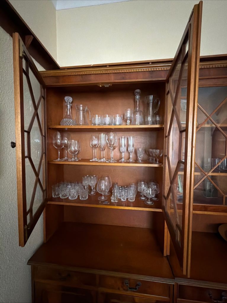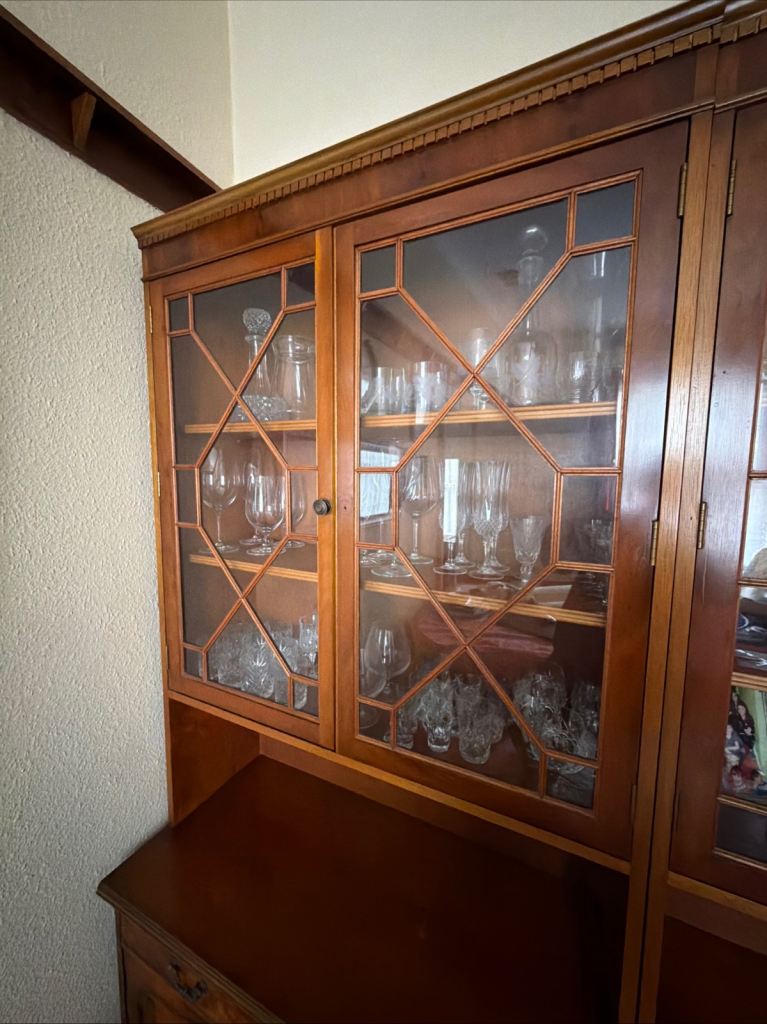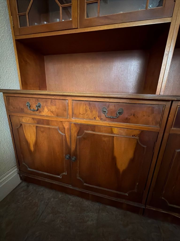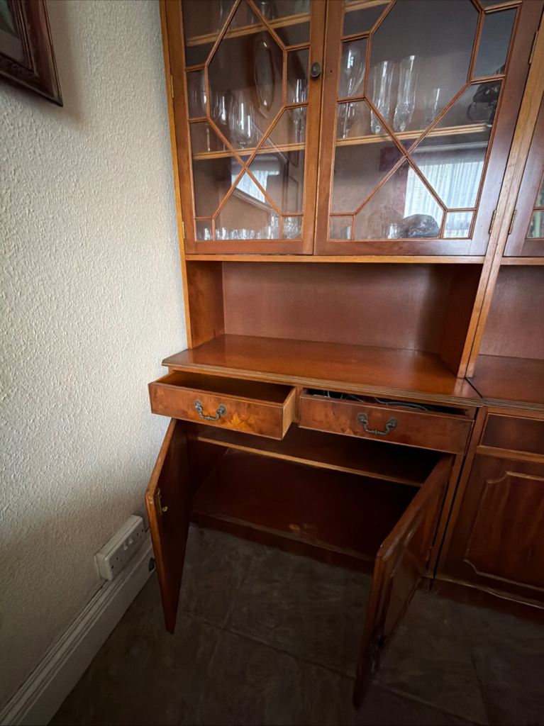 Vintage/ antique wooden display cabinet with shelves and two draws. Three shelves inside glass cabinet. Two shelves inside bottom cupboard. Was used to display glasses and crockery.