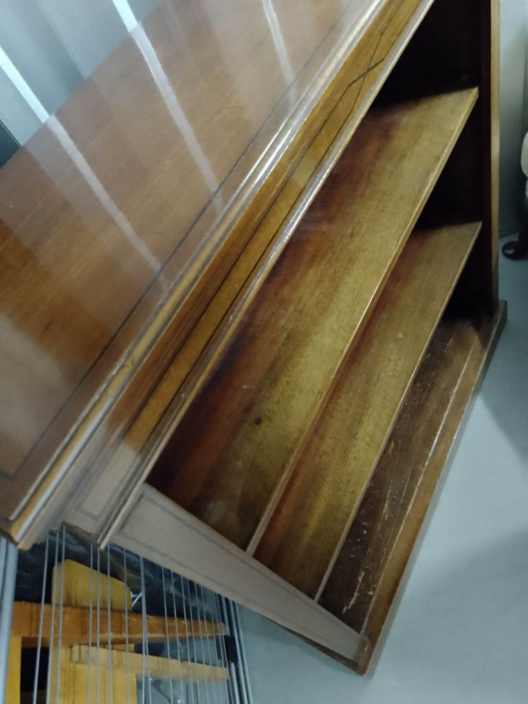 Solid wood, with shiny veneer top. Adjustable shelving, using interesting wooden support mechanism. Nearest offer.