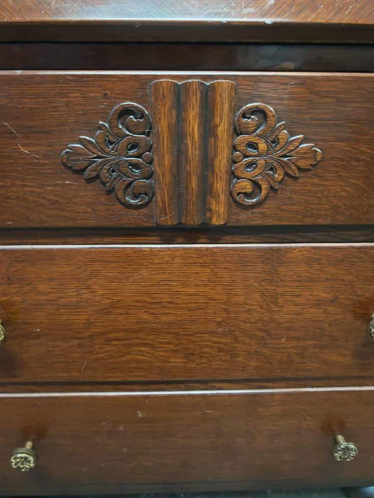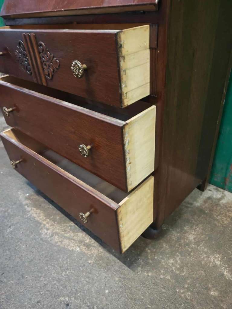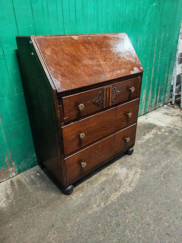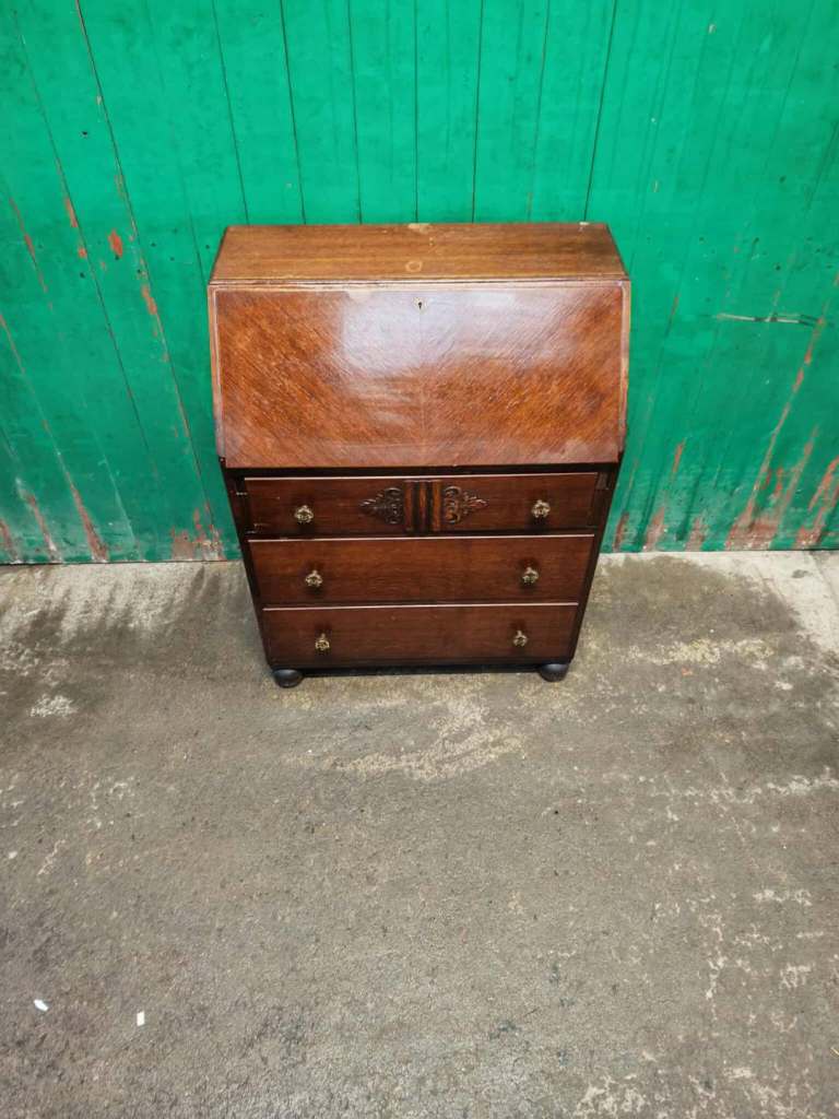This is a lovely vintage lebus writing bureau. The bureau has flip down desk area with leathwr top. There is 3 drawers all with solid dovetail joints. Lovely detail on drawer front and handles.
