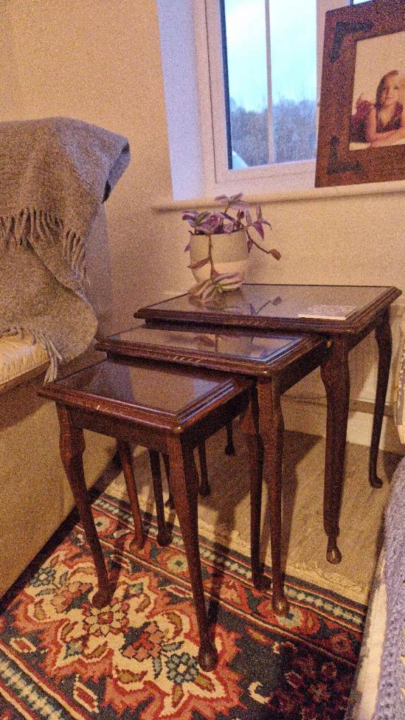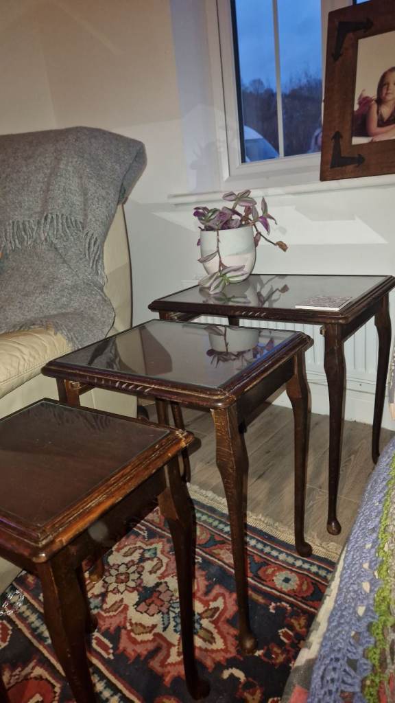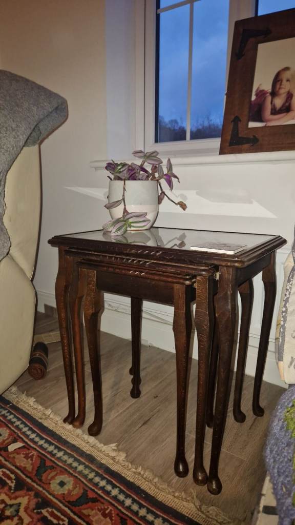 Beautiful set of three vintage nesting tables in a classic Queen Anne style, featuring elegant curved cabriole legs and rich dark wood finish. Each table slides neatly underneath the other, making them both practical and stylish.