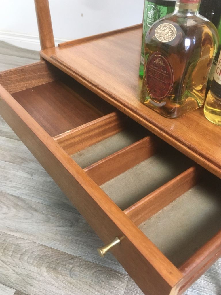 Mid Century drinks trolley with drawer and removable serving tray top, by White & Newton. Part felt lined drawer with teak dividers.