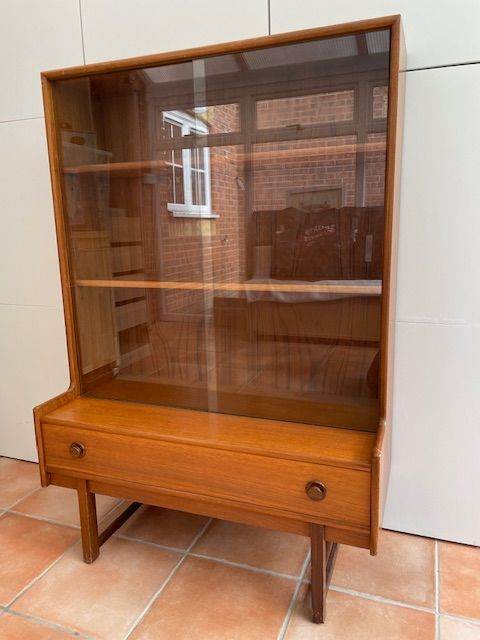 Vintage / Retro Teak Glazed Display Cabinet / Bookcase with single drawer.